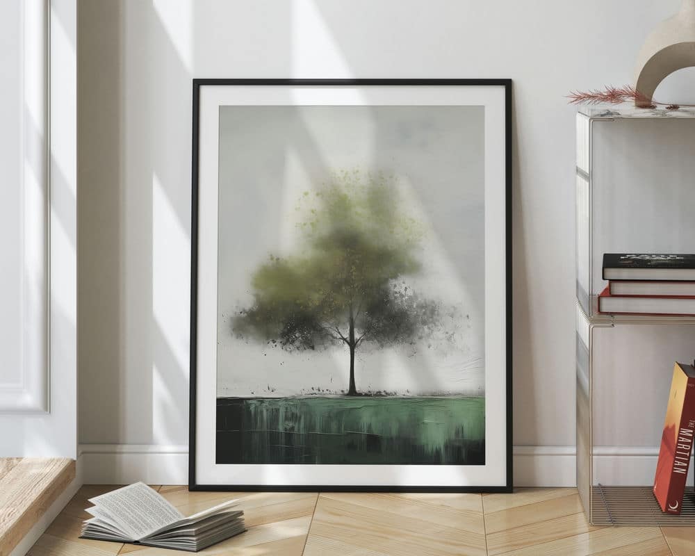 ציור ממוסגר, שכותרתו "תמונה למשרד נוסח אבסטרקט ציור עץ מופשט", מציג עץ בודד עם חופה ירוקה וצהבהבה הניצבת על שדה דשא. הרקע מציג שמים בהירים, עמומים עם שיפוע רך. היצירה תלויה על קיר לבן מעל ספה בז', מלווה במנורה מודרנית משמאל.