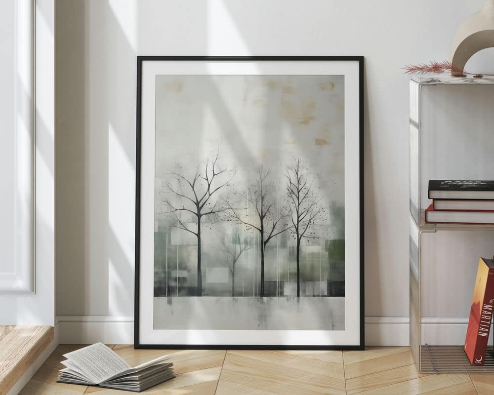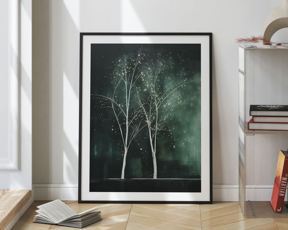 ציור ממוסגר שכותרתו "תמונה למשרד נוסח אבסטרקט עצים לבנים על רקע ירוק", המתאר שני עצים עדינים, לבנים וחסרי עלים על רקע ירוק כהה ומופשט, תלוי על קיר בהיר מעל ספה בז'. מנורת שולחן מודרנית עם עיצוב מסגרת חוט יושבת לצידה.