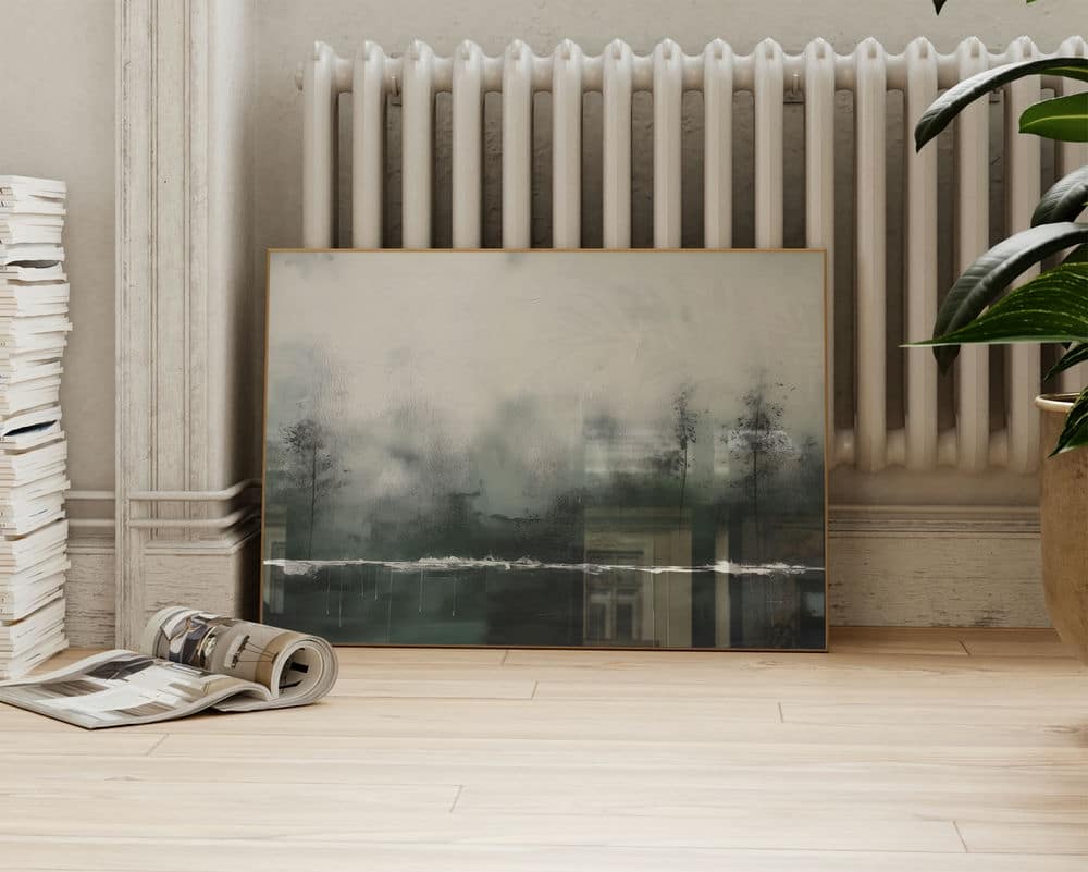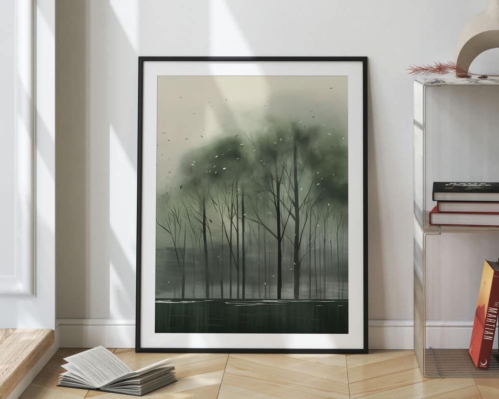 אמנות קיר אנכית שכותרתה "תמונה למשרד נוסח אבסטרקט יער חורפי בירוק כהה" המתארת סצנת יער עם עצים גבוהים ודקים על רקע ירוק מעורפל ומאופק. היצירה ממוסגרת בלבן ותלויה מעל ספה בז'. משמאל לתמונה מנורה מודרנית הכוללת גוון לבן ובסיס מסגרת חוט.