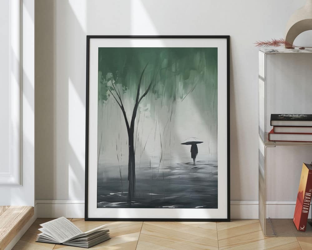 ציור ממוסגר תלוי על קיר לבן מעל ספה בצבע בז' בהיר. יצירת האמנות, שכותרתה "תמונה לחדר שינה נוסח אבסטרקט דמות הולכת ביער גשום ירוק", מתארת דמות בודדה אוחזת מטריה, עומדת מתחת לעץ בנוף גשום ומעורפל. נראית גם מנורה מודרנית עם גוון לבן ובסיס מסגרת חוט שחור.