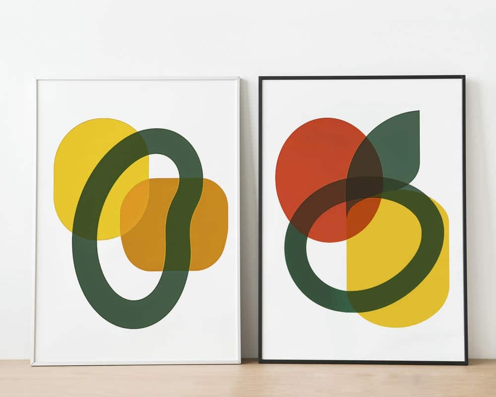 שני הדפסים ממוסגרים מסט סט פוסטרים למטבח נוסח מינימליסטי פירות מופשט תלויים על קיר לבנים לבנים מעל שידה צהובה. ההדפס השמאלי כולל צורות חופפות של ירוק, צהוב וכתום. ההדפס הימני מציג צורות מצטלבות באדום, ירוק, צהוב וכתום. קקטוס קטן יושב על השידה.