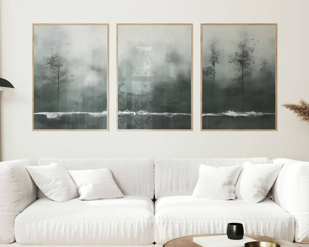 סלון מינימליסטי כולל ציור גדול ומופשט של יער חורפי ירוק כהה מעל ספה רכה בצבע שמנת עם כריות מרובות. שולחן קפה קטן ולבן נמצא בחזית הספה, ותאורת תליון נצרים תלויה מהתקרה. שולחן צד קטן מחזיק אגרטל עם פרחים.