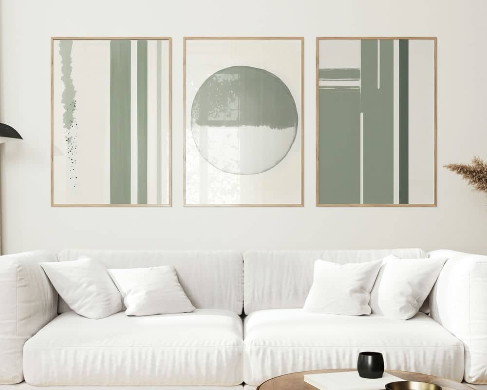 סלון מינימליסטי כולל ספה בצבע בז' בהיר המעוטרת בכריות לבנות ובז'. מעל תלויה על הקיר סט 3 תמונות לסלון נוסח מינימליסטי קווים ירוק עדין, המציגה שלוש יצירות אמנות מופשטות בגווני ירוק ולבן עמומים. החדר כולל גם שולחן קפה מעץ עם נרות ואגרטל עם צמחים יבשים.