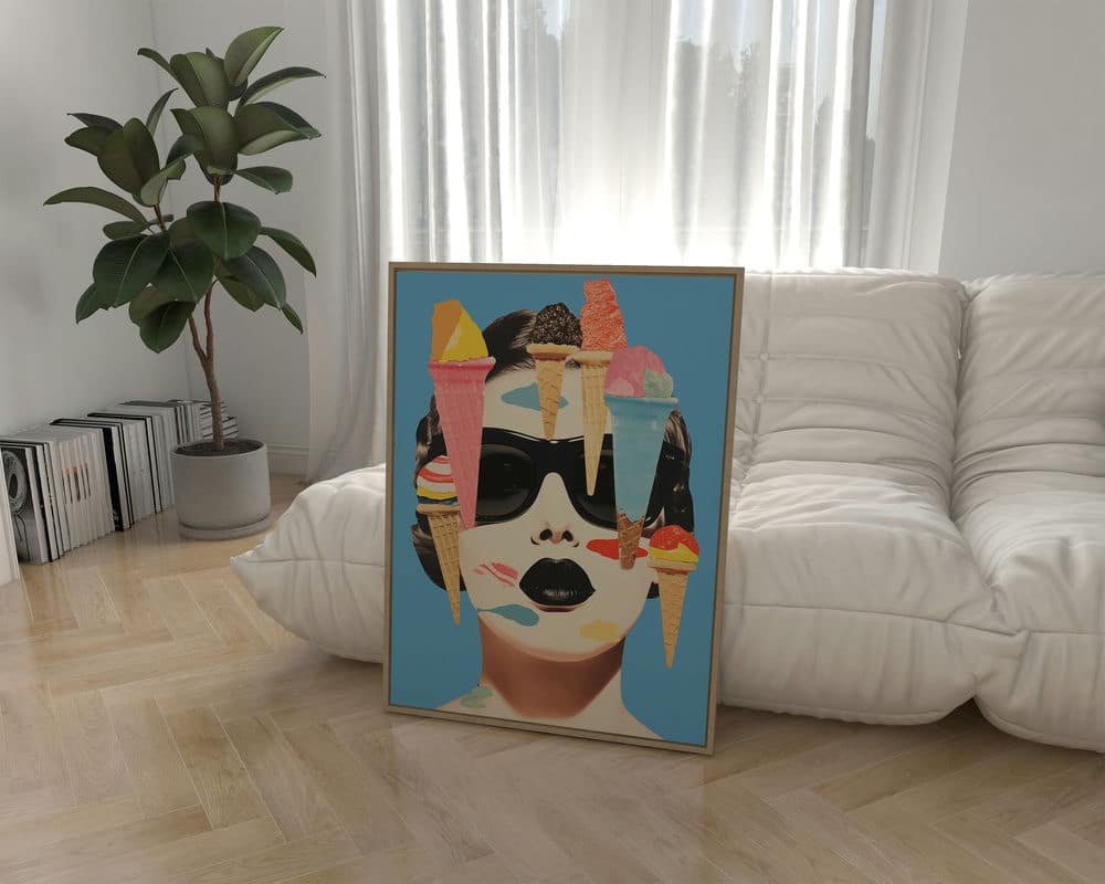 הפוסטר הזה בסגנון רטרו קולאז' של אישה וגלידות מושלם להוספת צבע במטבח או בפינת אוכל. אפשרות לפוסטר בודד או לפוסטר ממוסגר מראש במסגרות איכותיות בהכנה אישית!