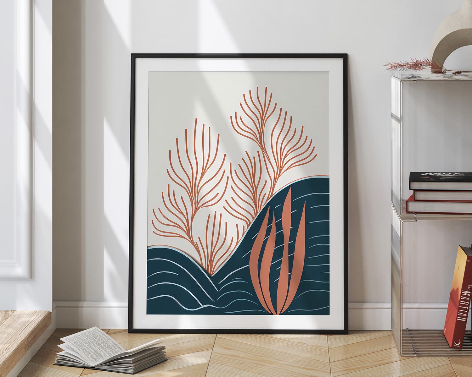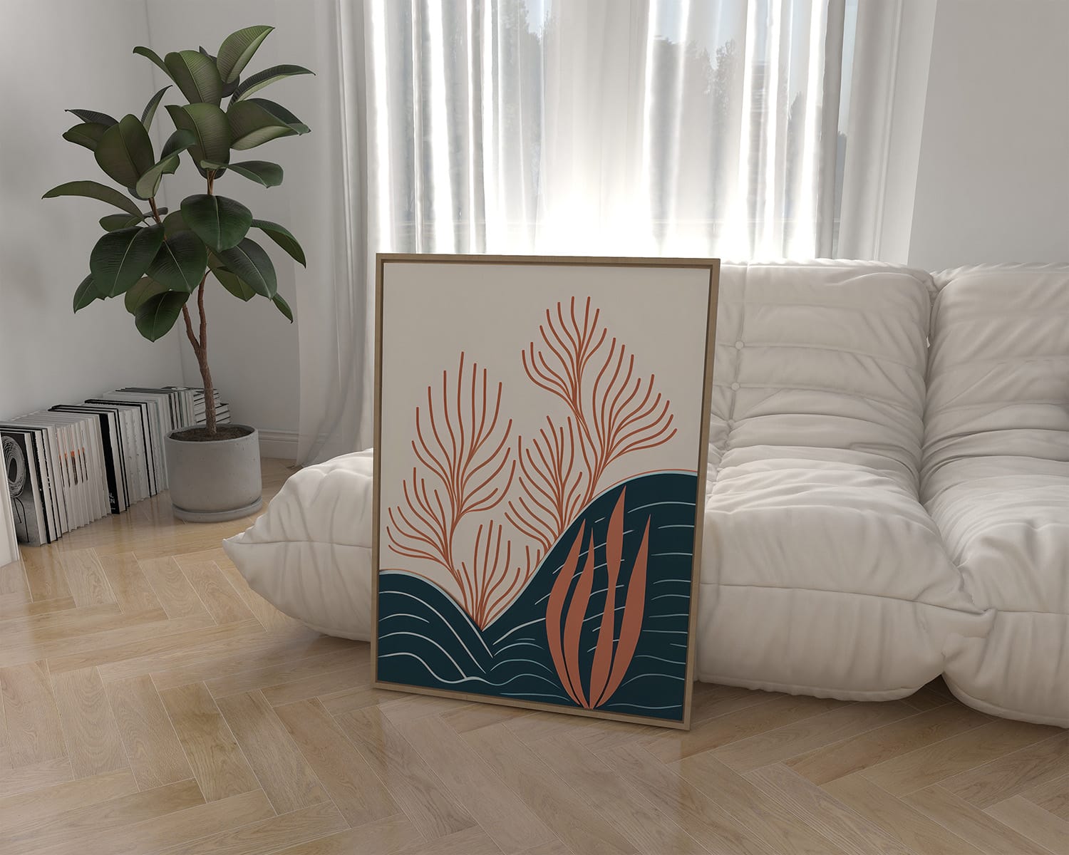 תמונה לחדר שינה בסגנון בוהו שיק אלמוגים כתומים מתחת לגלי ים