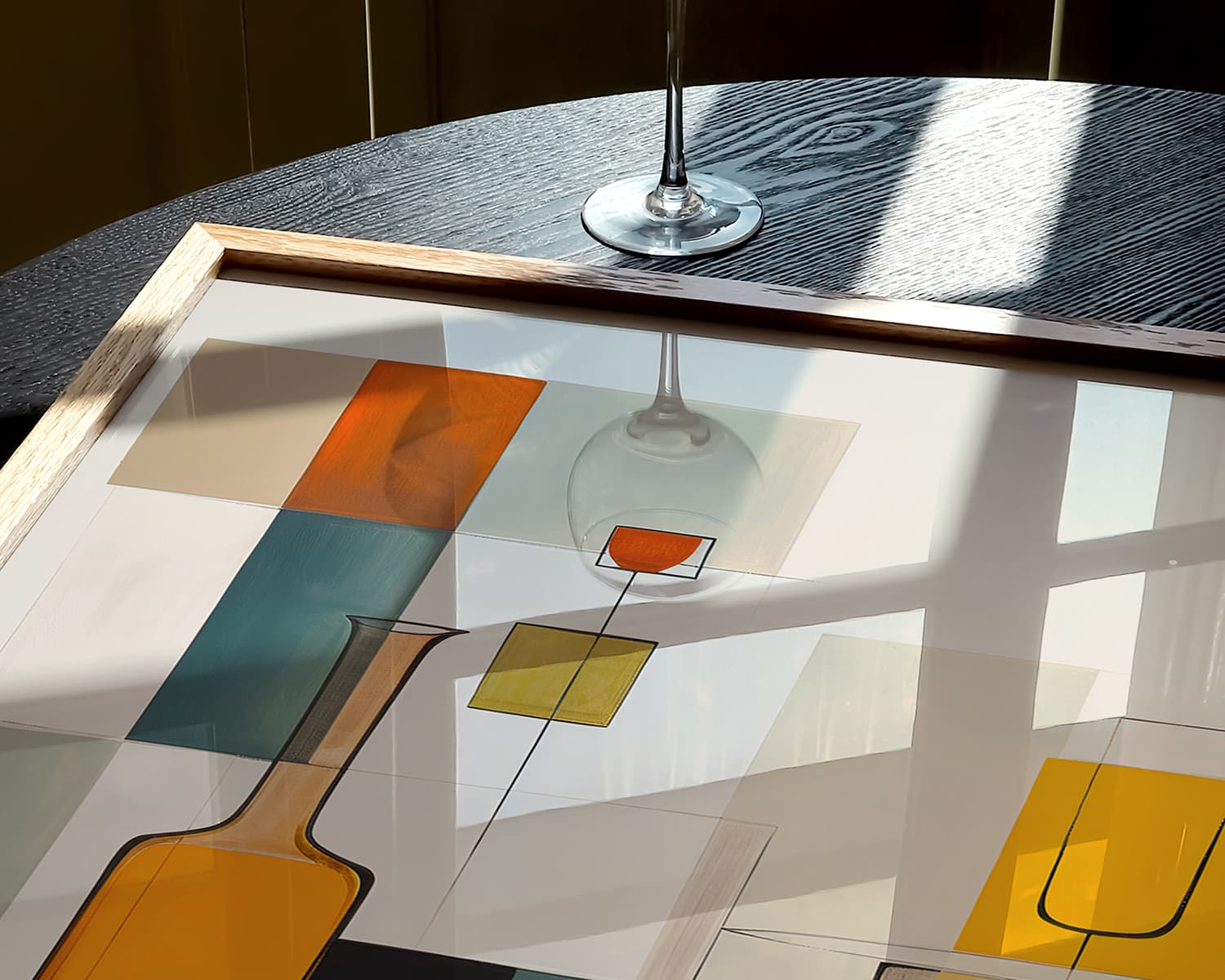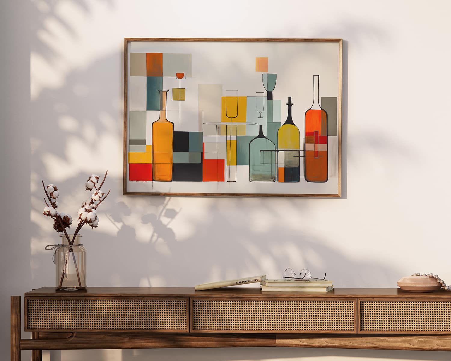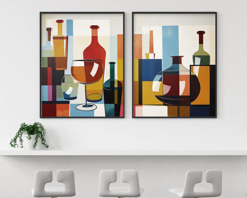 תמונה לפינת אוכל ומעל הספה בעיצוב אבסטרקט מודרני בקבוקי יין וכוסות