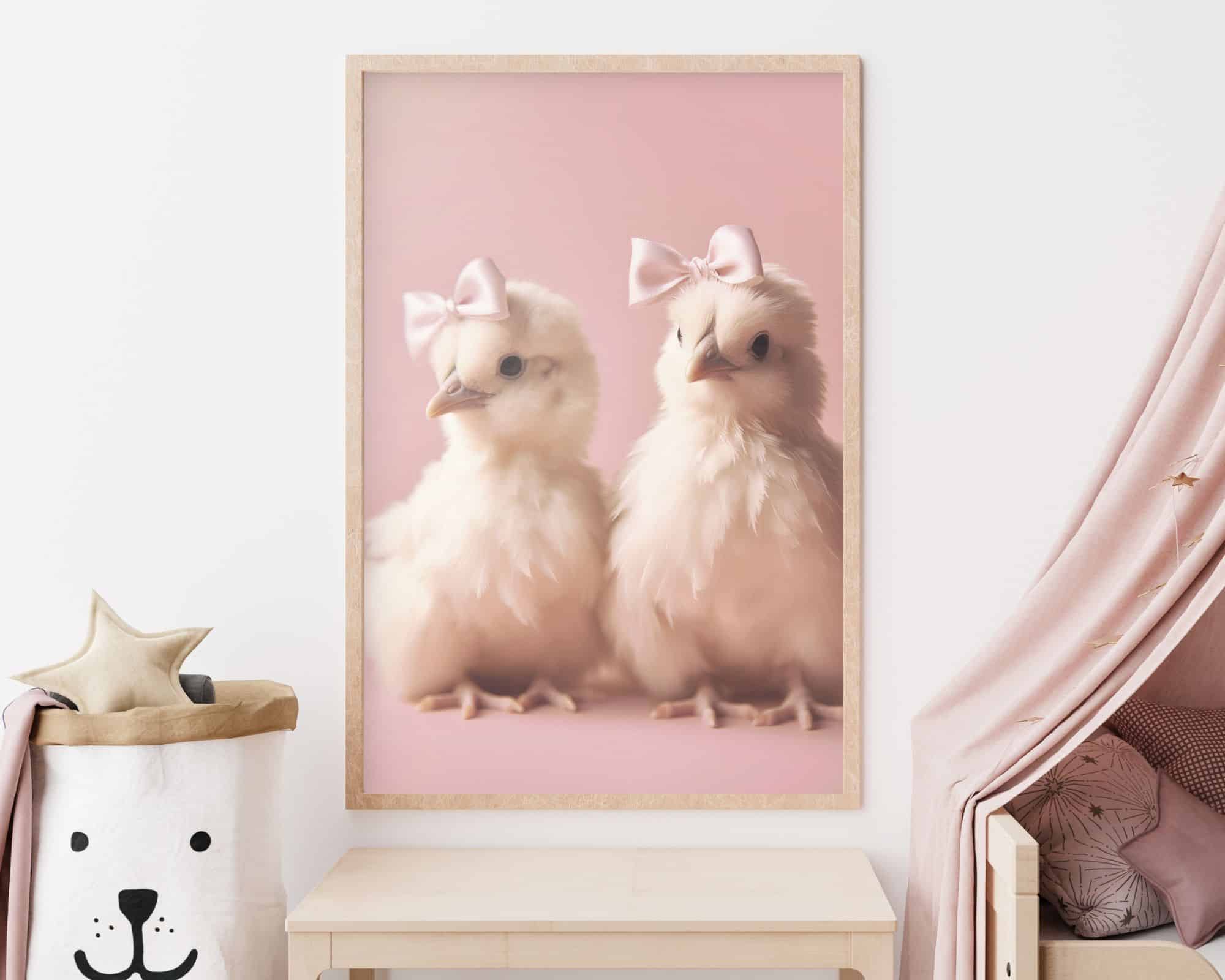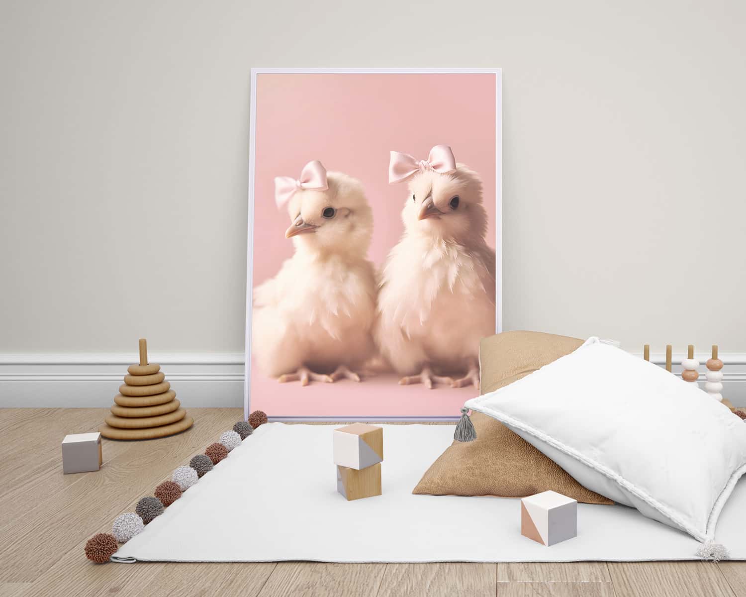 הפוסטר הזה של שני אפרוחים מתוקים מושלם לחדר של ילדה שאוהבת ורוד ובעלי חיים. אפשרות לפוסטר בודד או לפוסטר ממוסגר מראש במסגרות איכותיות בהכנה אישית!