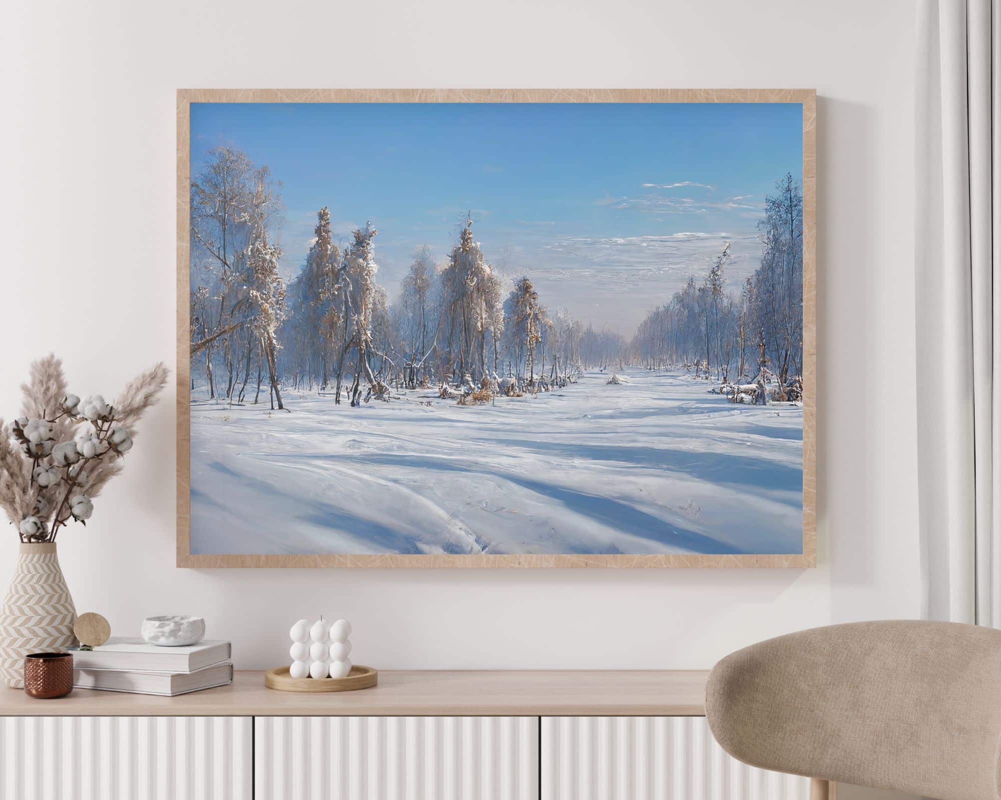 תמונה לחדר שינה מעל המיטה בסגנון ציור וינטג' נוף יער מושלג בחורף