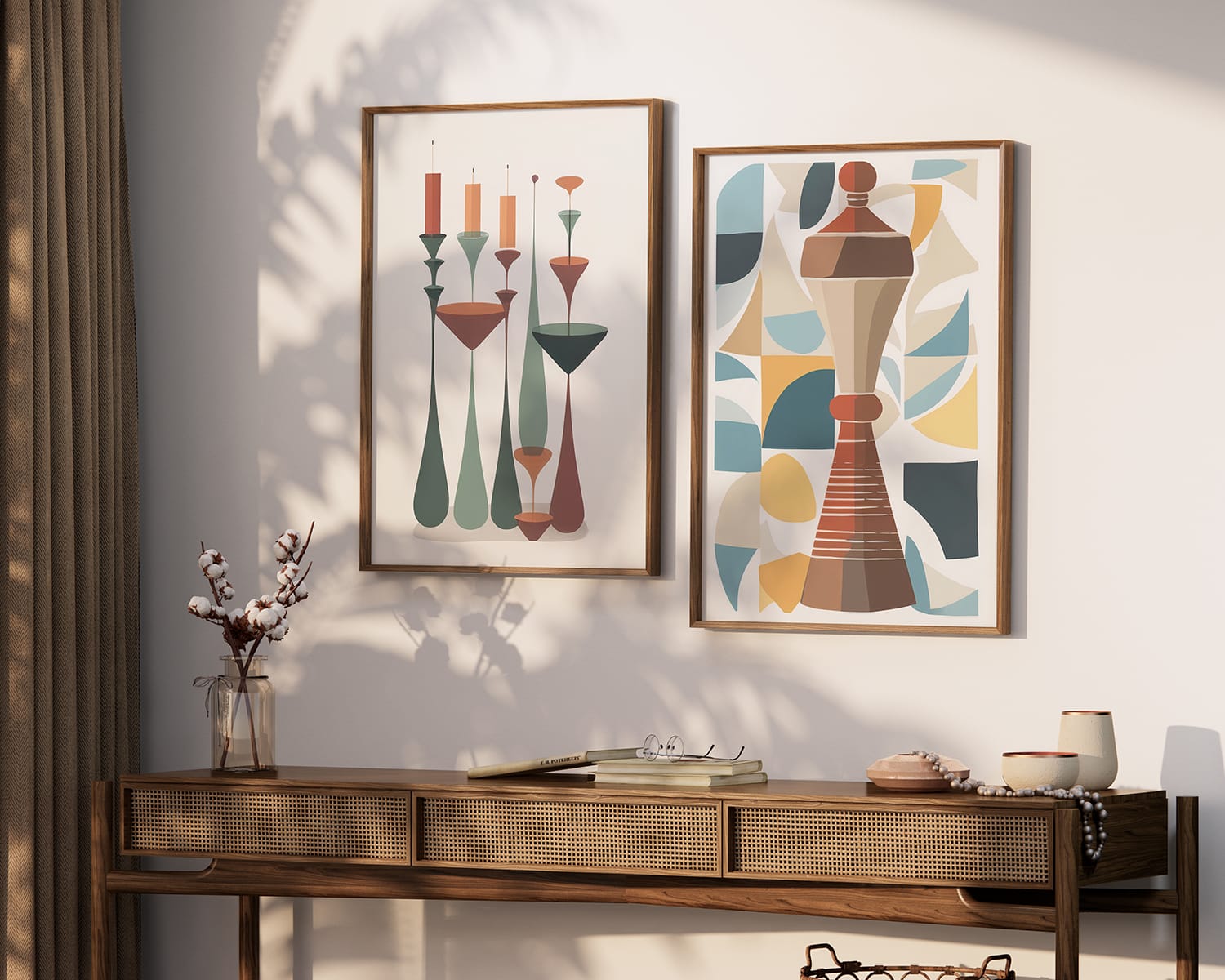 תמונה לפינת אוכל ומעל הספה כוסות קפה שונות בגוונים רכים