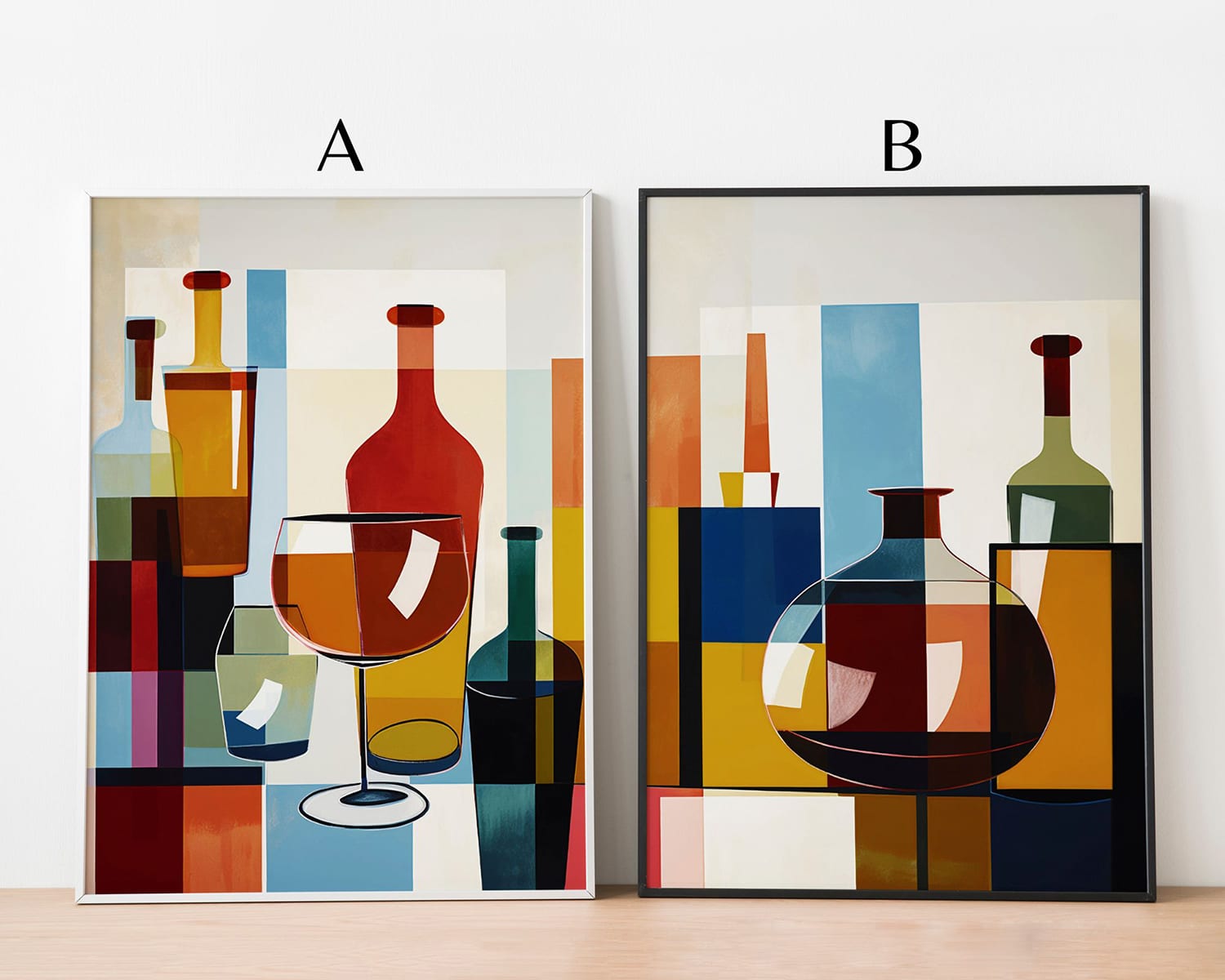 סט פוסטרים לפינת אוכל ומעל הספה בסגנון מודרני מופשט בקבוקים וכוסות