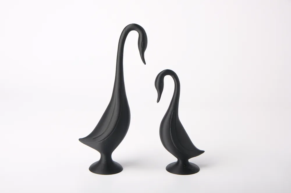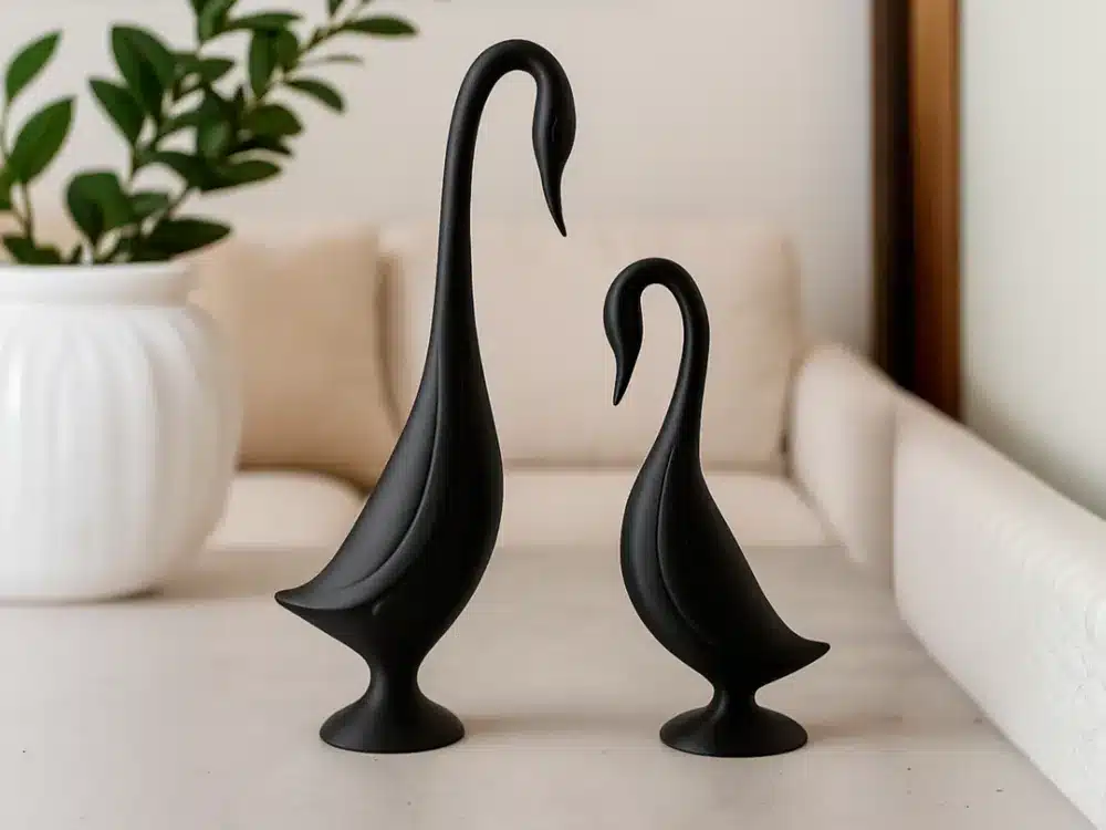 סט פסלי הברבורים המודרניים מביא איתו נוכחות שקטה, אלגנטית ומלאת רוך. עם קווים זורמים, צוואר מעוגל ודמות מופשטת ונקייה – כל פסל משדר שלווה, הרמוניה ויוקרה עדינה. הגימור השחור המט מדגיש את הצורניות המינימליסטית והמודרנית, והוא משתלב בצורה מושלמת עם כל סגנון עיצוב: סקנדינבי, מודרני, יוקרתי או טבעי. הצמד יוצר קומפוזיציה הרמונית במיוחד, אך כל פסל יכול גם לעמוד בפני עצמו כאובייקט דקורטיבי מרשים. מושלם למדפים, שידות, קונסולות או פינות ישיבה – סט הברבורים מוסיף תחושת רוגע ואסתטיקה גבוהה לכל חלל. אידיאלי גם כמתנה יוקרתית לאוהבי עיצוב וניקיון צורני.
