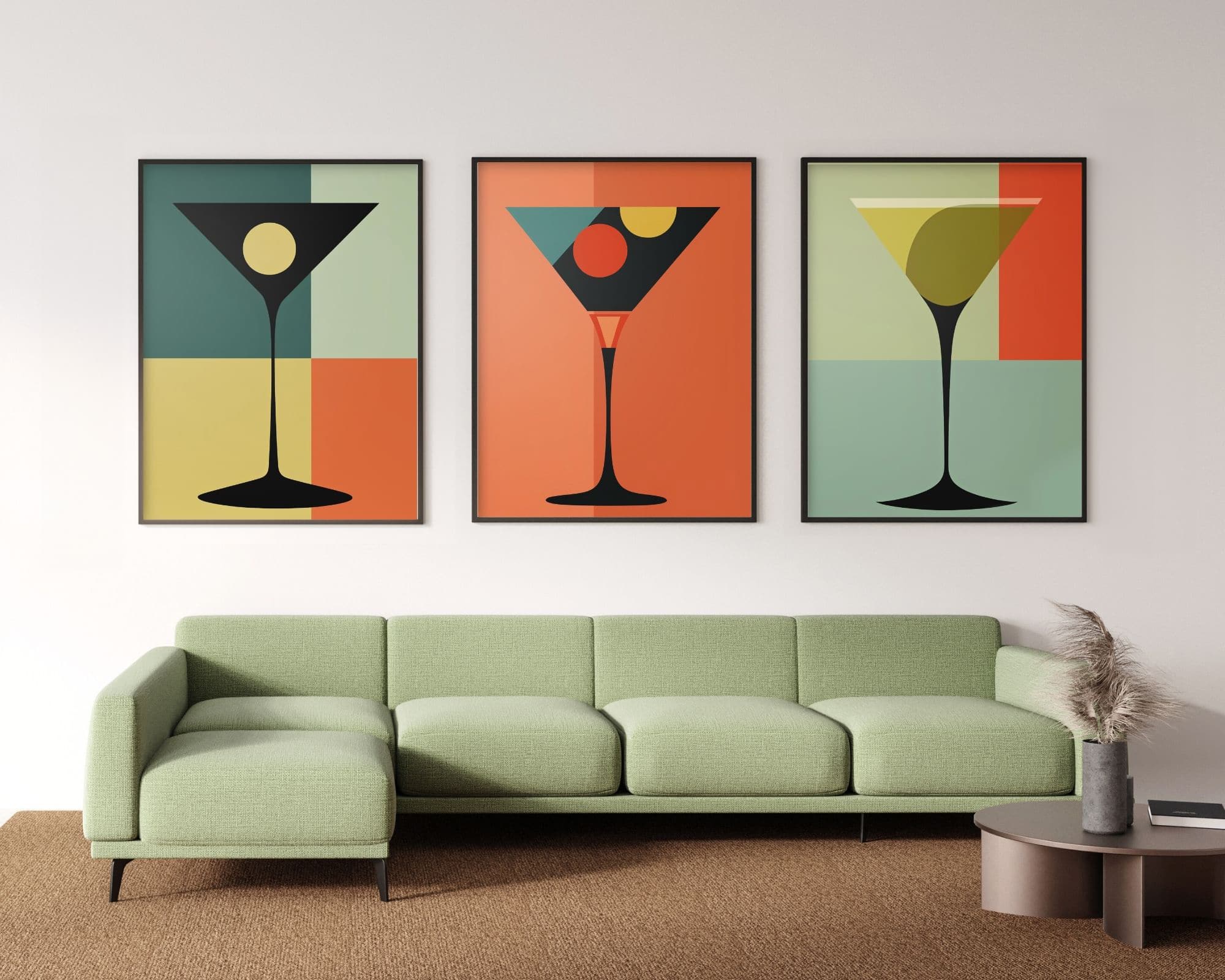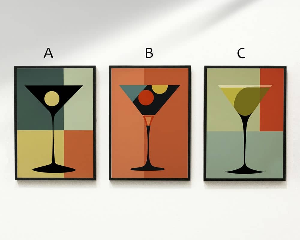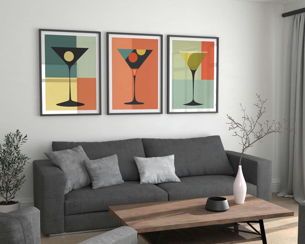 שילישיית פוסטרים לסלון מעל הספה בסגנון מודרני מיד סנצ'ורי כוסות קוקטייל