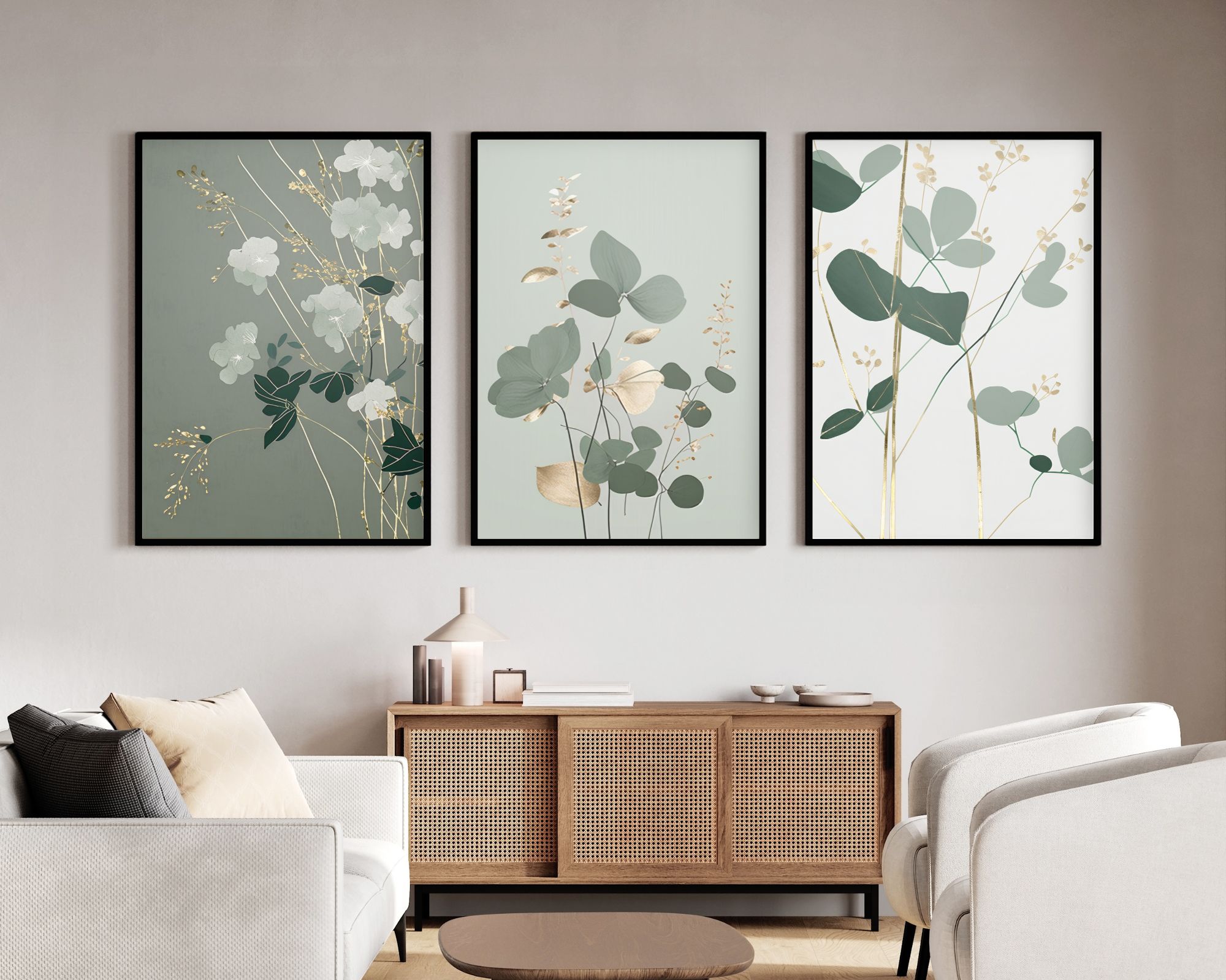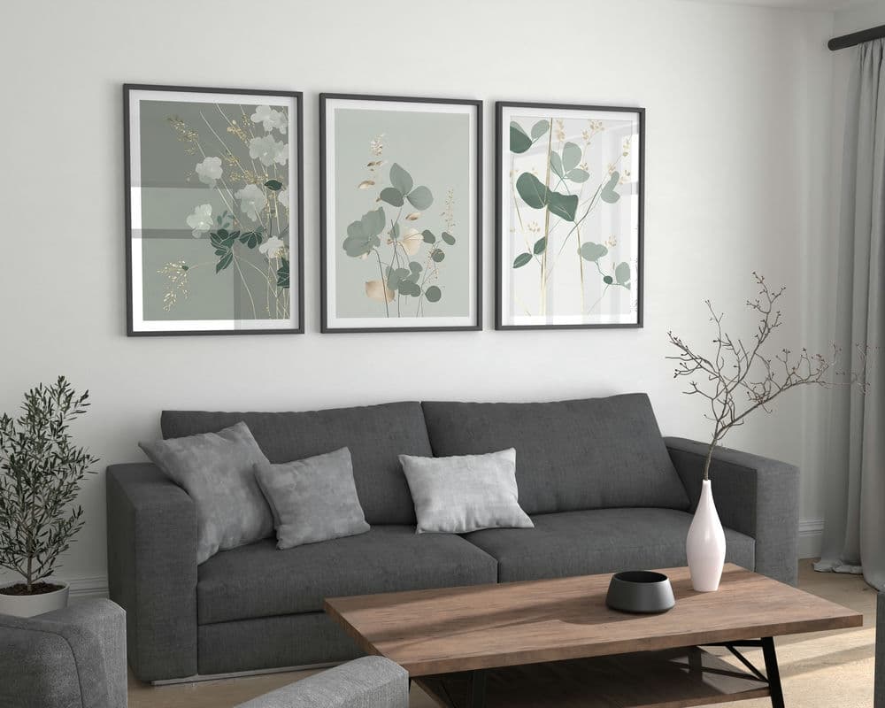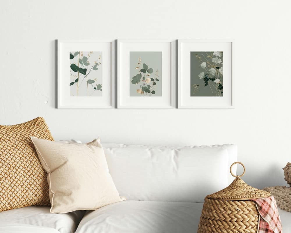 שלישיית פוסטרים לחדר שינה בסגנון מינימליסטי פרחים בירוק מרווה לבן וזהב