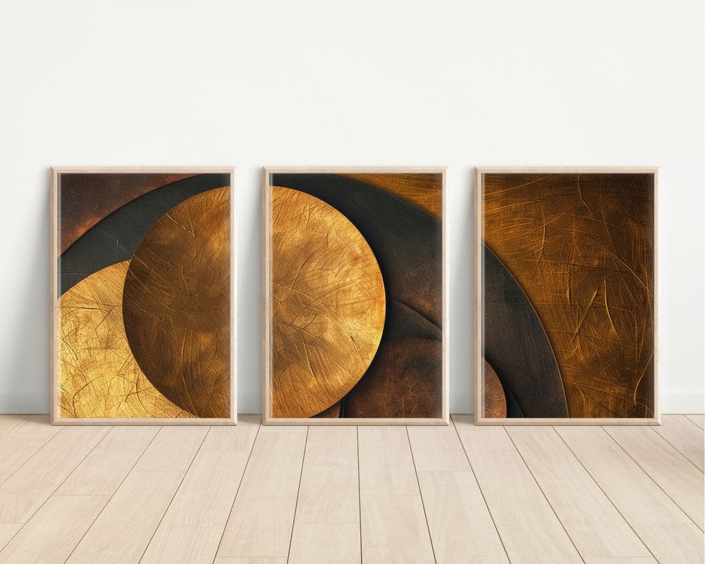 הסט הזה של 3 תמונות לסלון בעיצוב אבסטרקט מודרני בצבעי זהב יראה מדהים בכל חלל. או לפוסטר ממוסגר מראש במסגרות איכותיות בהכנה אישית!