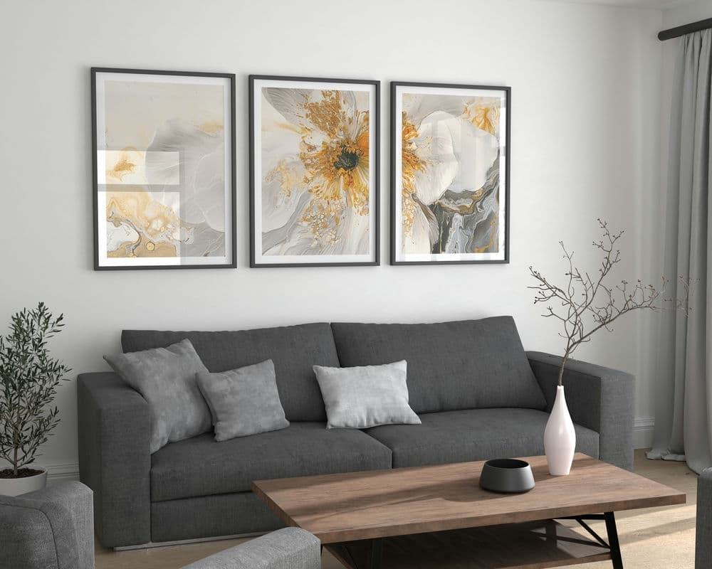 סט 3 תמונות לסלון פרח זהב ולבן בסגנון מינימליסטי