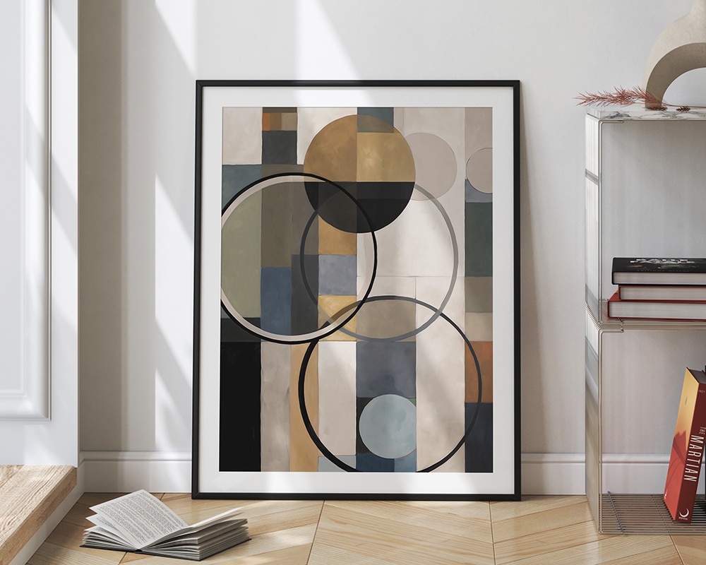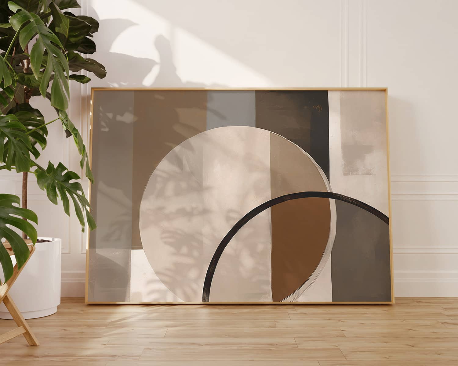 תמונה מעל הספה ומשרד בסגנון אבסטרקט עיגולים ומלבנים בגווני חום