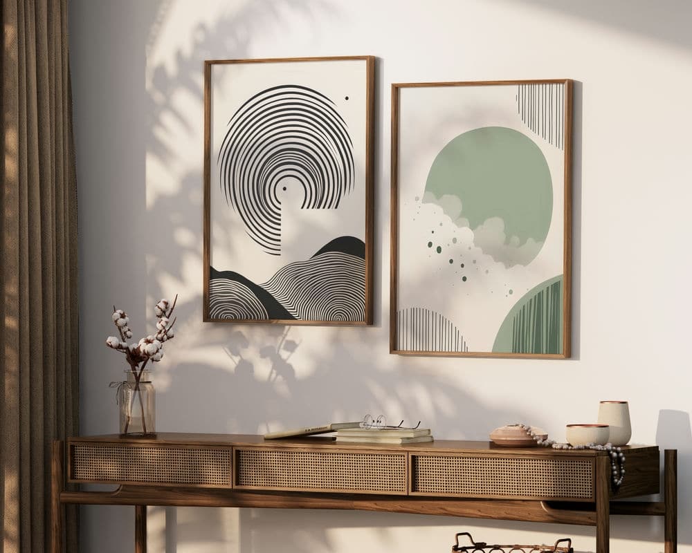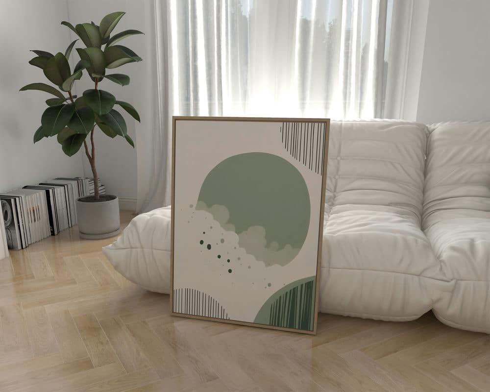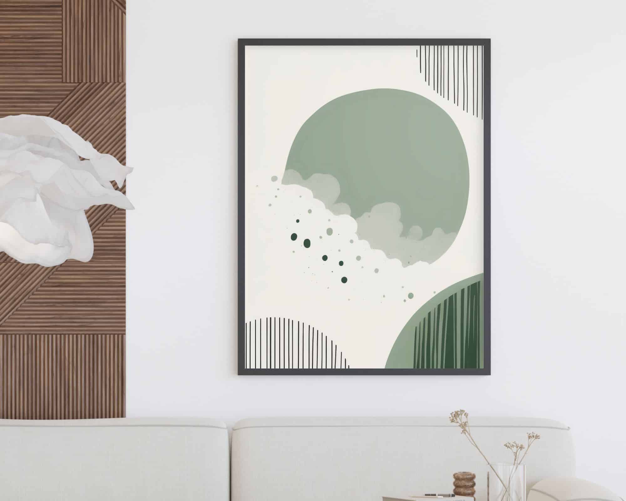 תמונה לחדר שינה בסגנון מינימליסטי עיגולים וקווים בצבעי ירוק מרווה