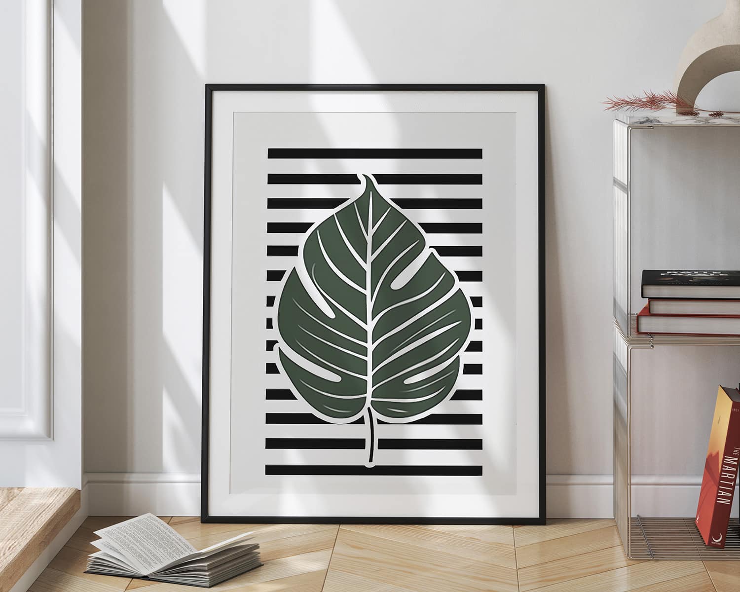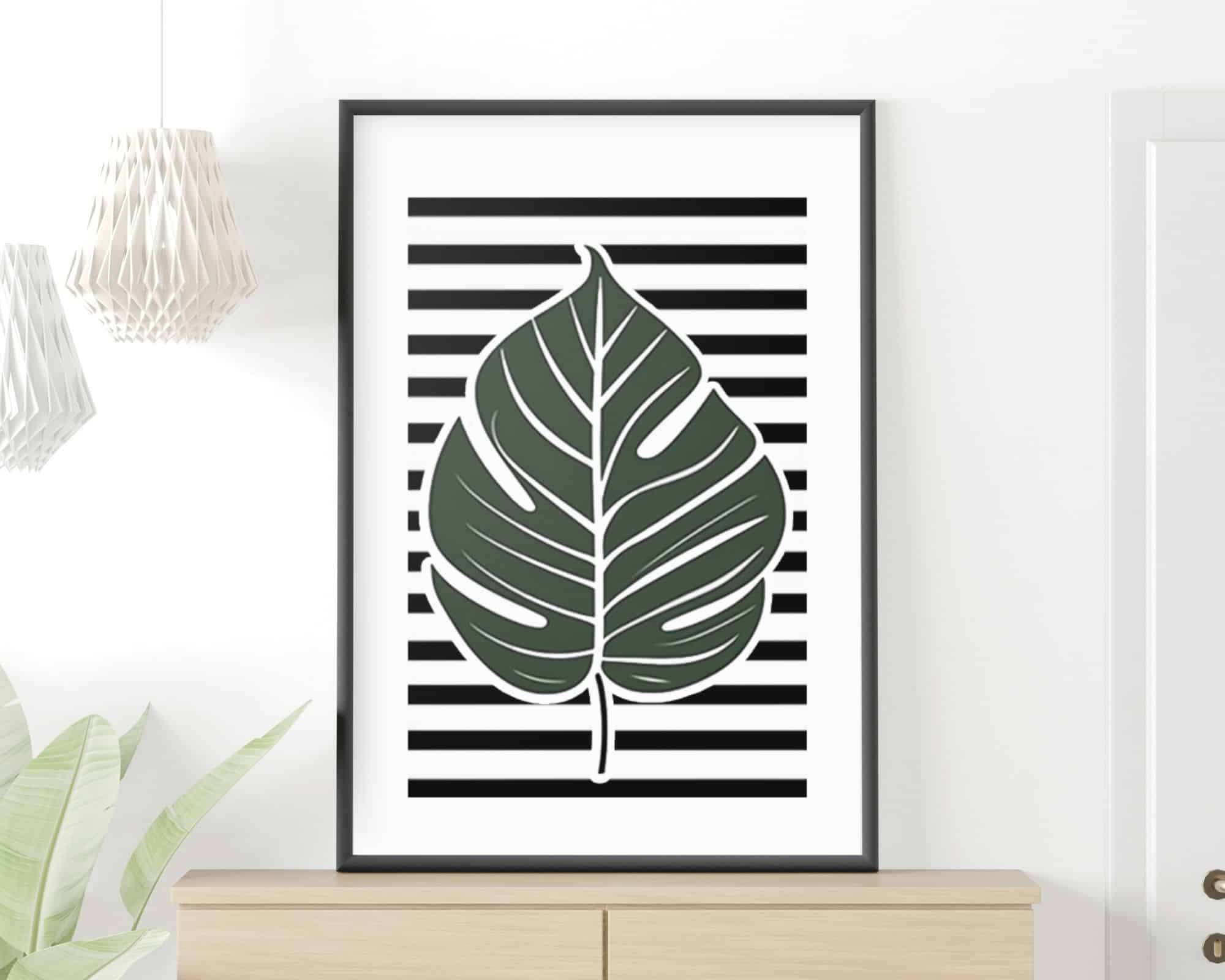 תמונה לסלון ולחדר שינה בעיצוב מינימליסטי עלה מונסטרה על רקע פסים