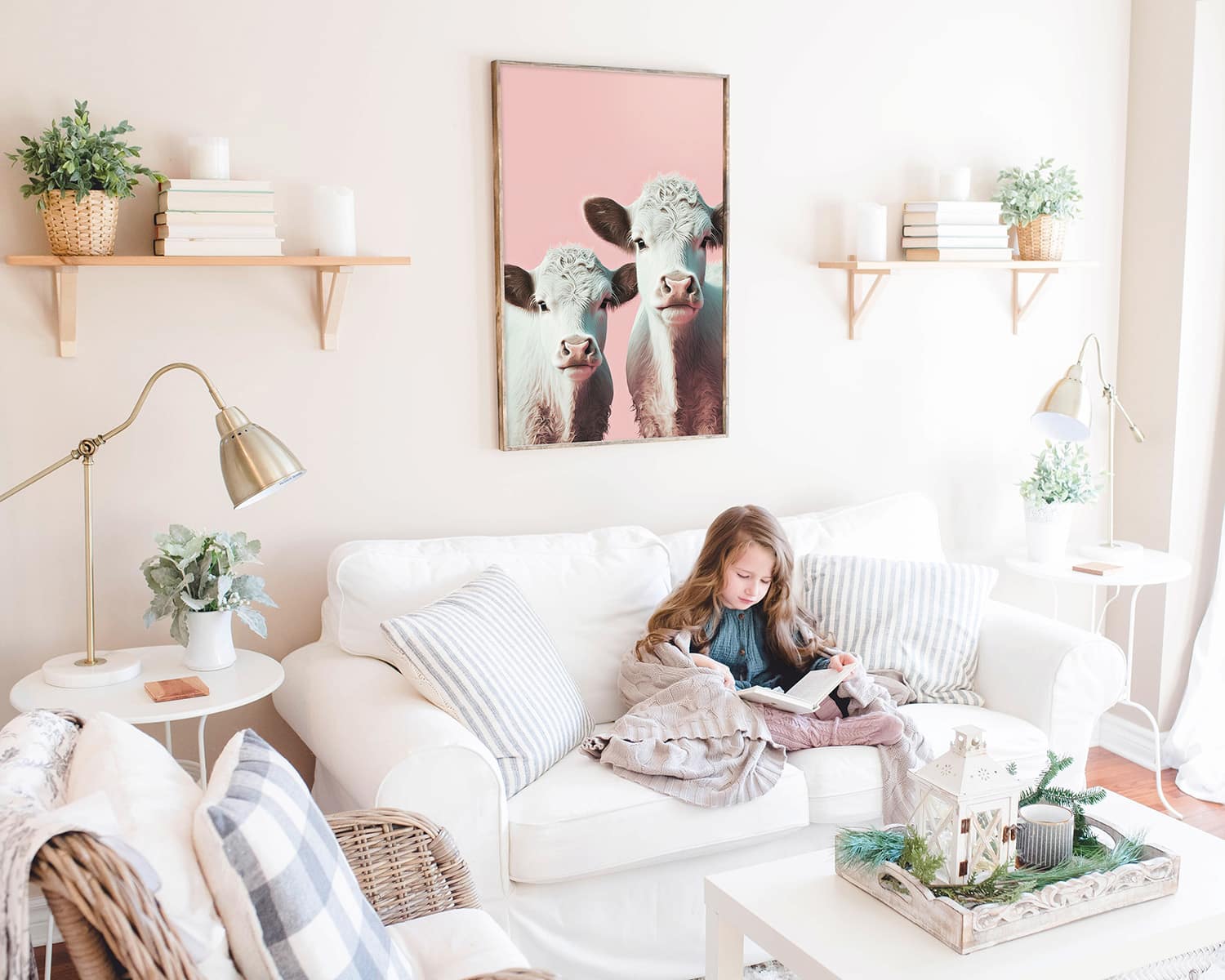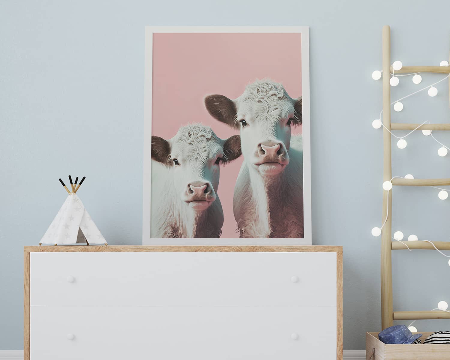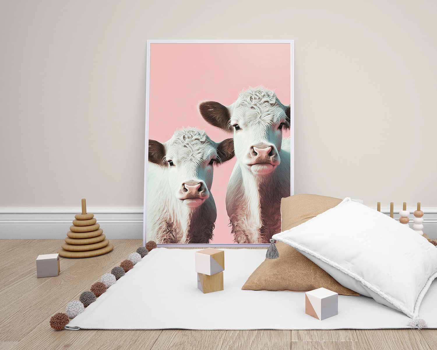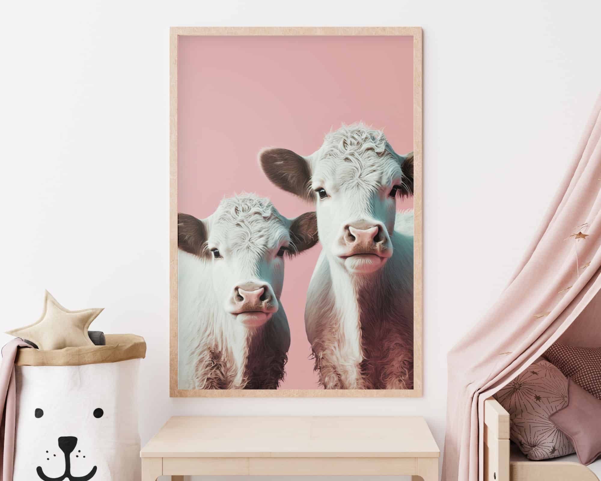 הפוסטר הזה של שתי פרות חמודות על רקע ורוד מושלם ליצירת אווירה עדינה בחדר ילדים. אפשרות לפוסטר בודד או לפוסטר ממוסגר מראש במסגרות איכותיות בהכנה אישית!