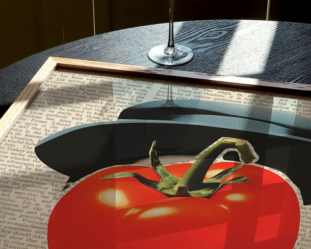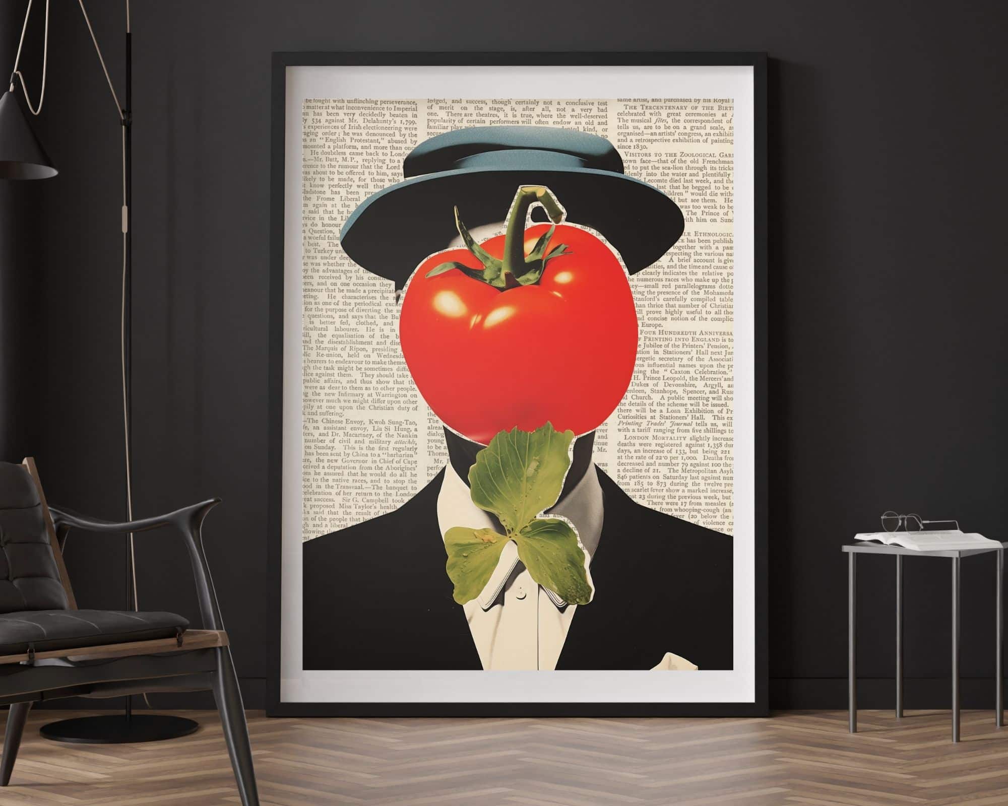 תמונה לפינת אוכל ולמטבח בסגנון קולאז' רטרו פורטרט סוריאליסטי של איש עגבניה