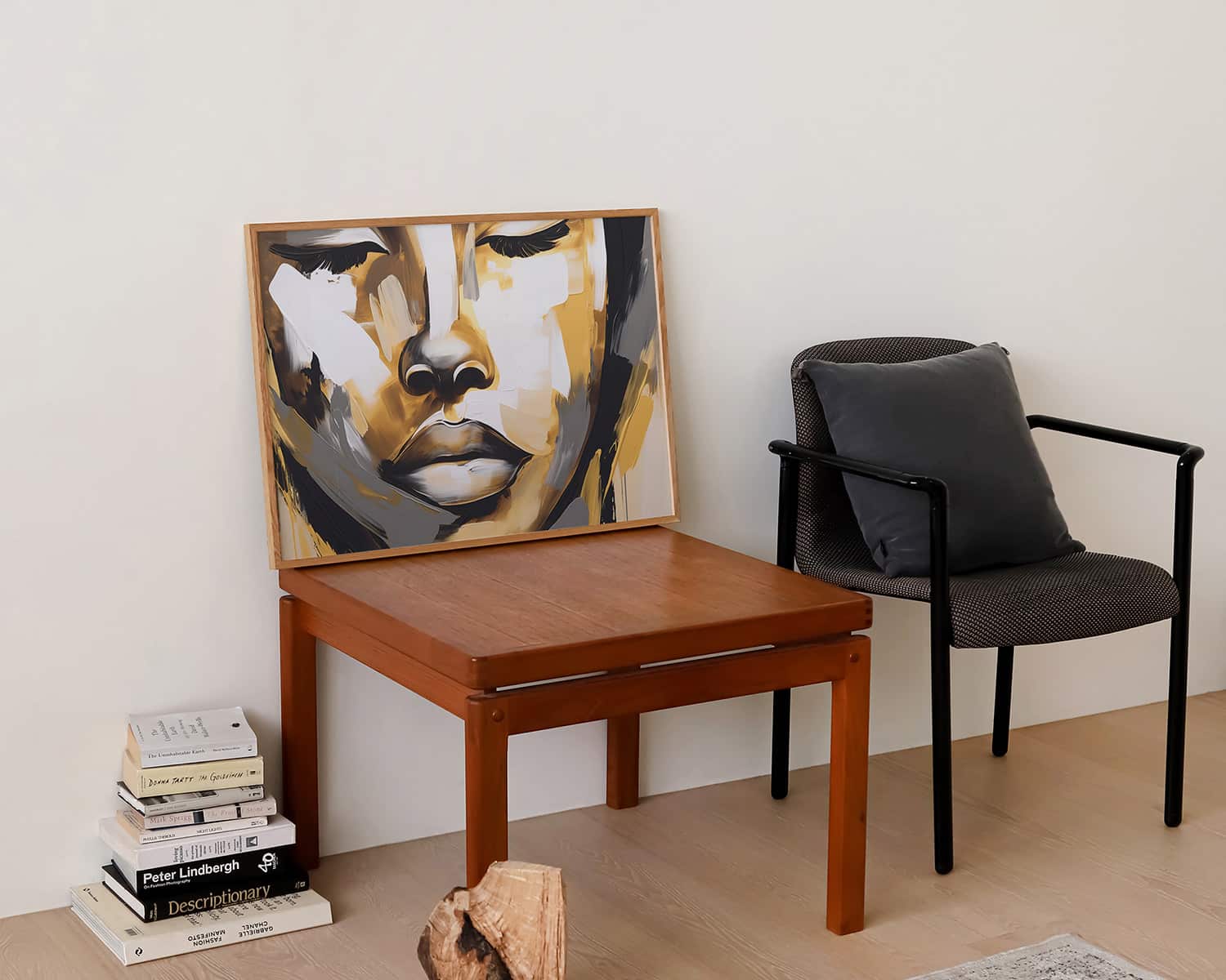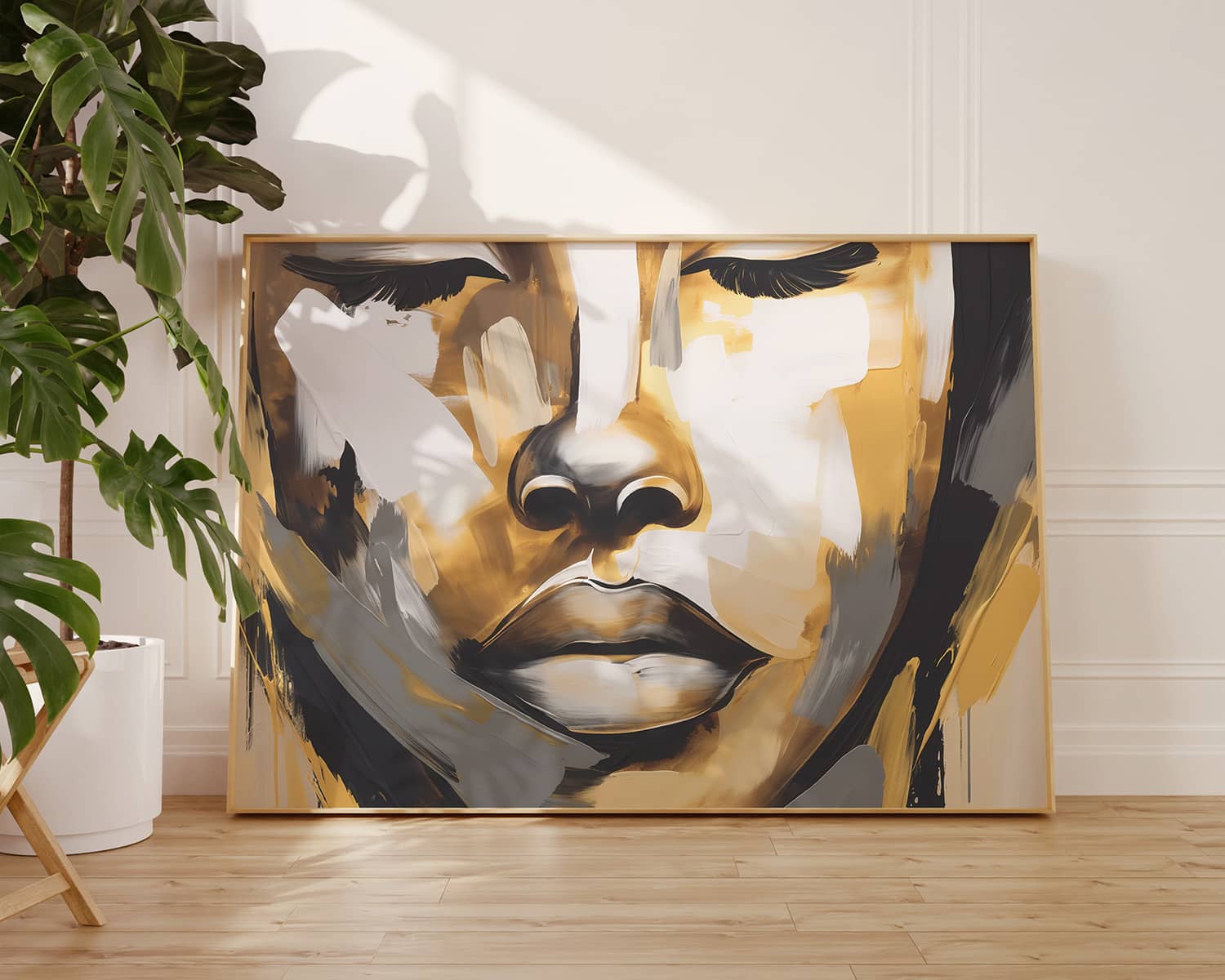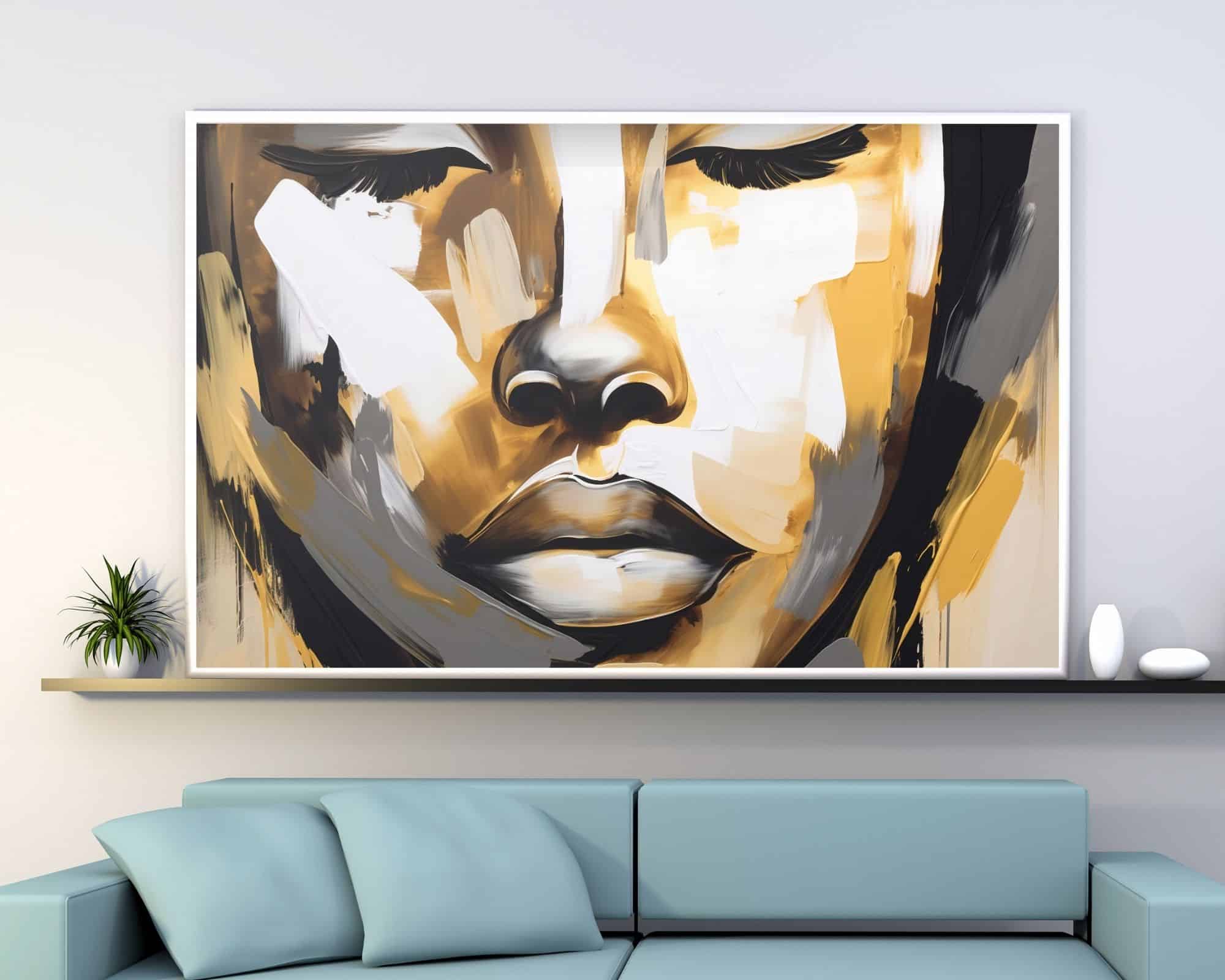 תמונה מעל הספה בסגנון גרפיטי פורטרט של אישה בצבעי זהב שחור