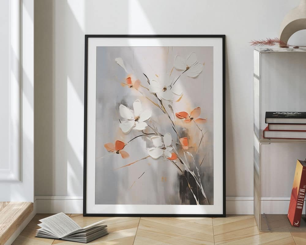 תמונה לחדר שינה בסגנון מופשט פרחים לבנים וכתומים
