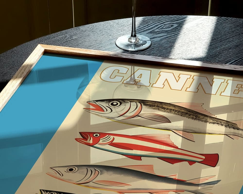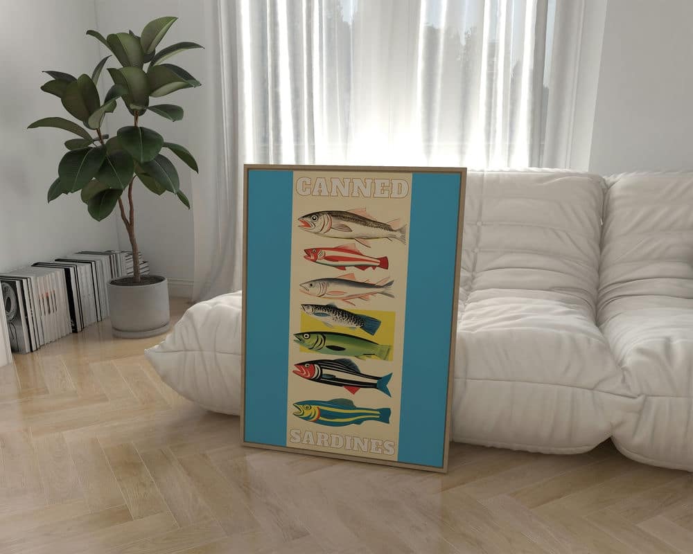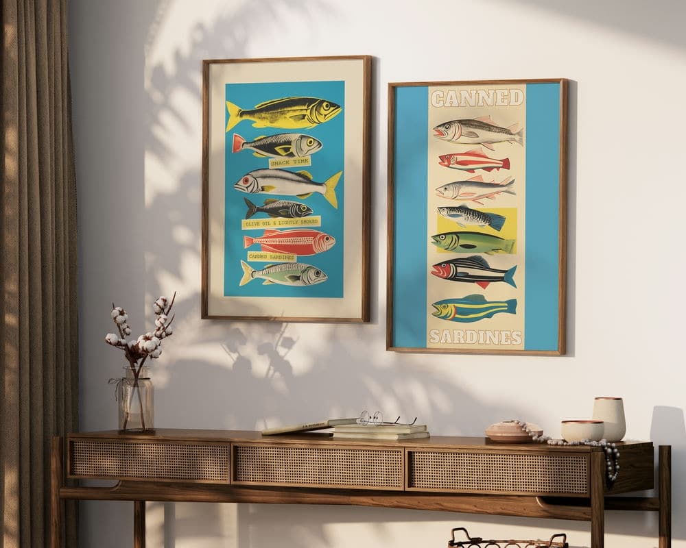 הפוסטר הזה בסגנון קולאז' של סרדינים צבעוניים מושלם להוספת צבע במטבח ובפינת אוכל שלכם. אפשרות לפוסטר בודד או לפוסטר ממוסגר מראש במסגרות איכותיות בהכנה אישית!