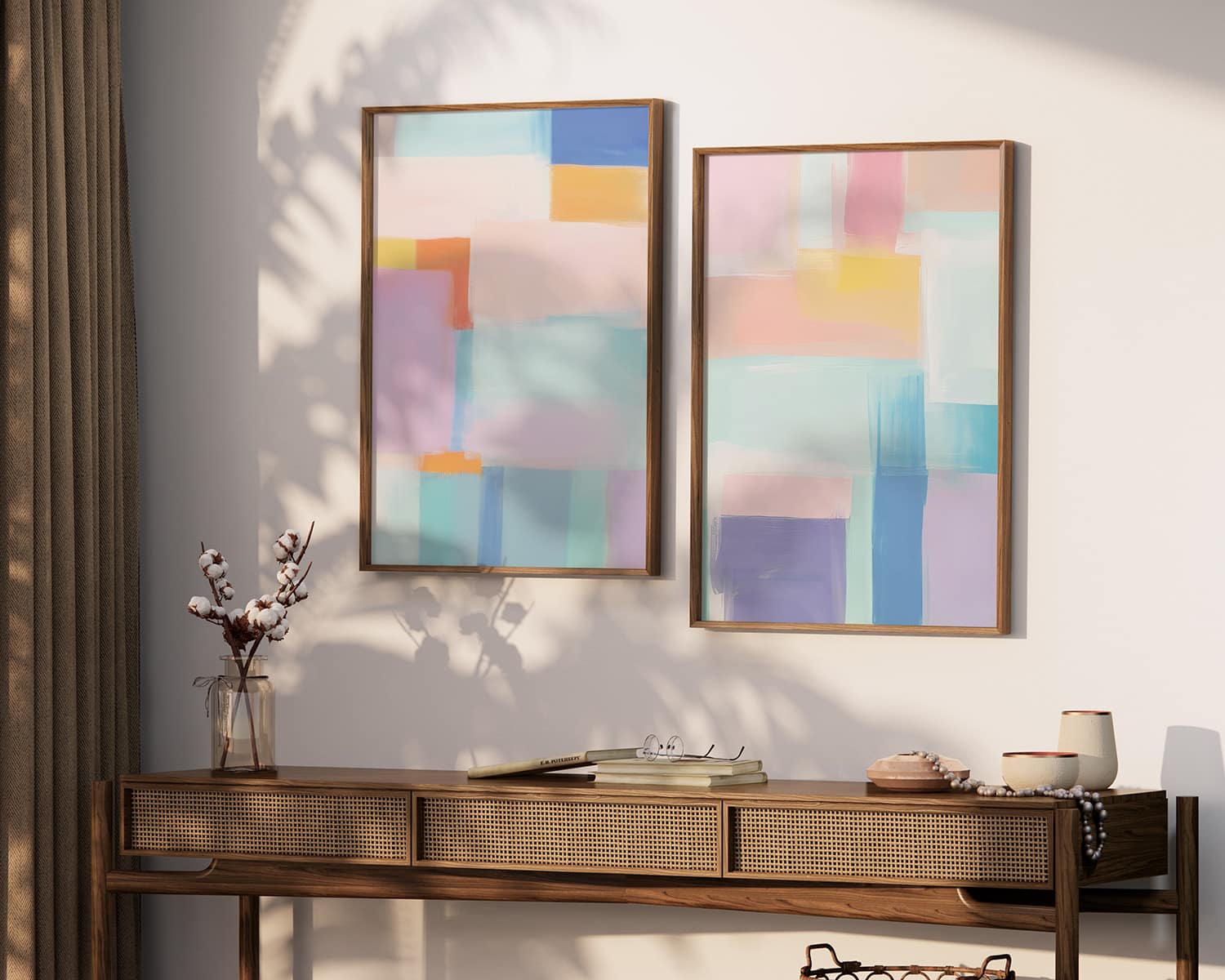 תמונה לחדר שינה בסגנון אבסטרקט ריבועים קולור בלוק בצבעי פסטל ב'