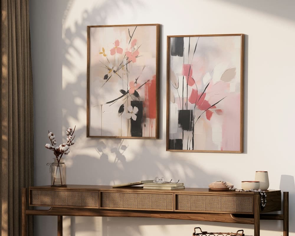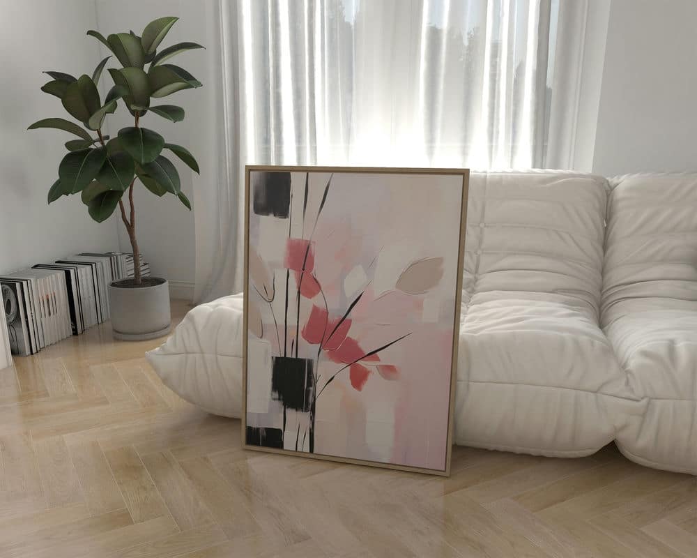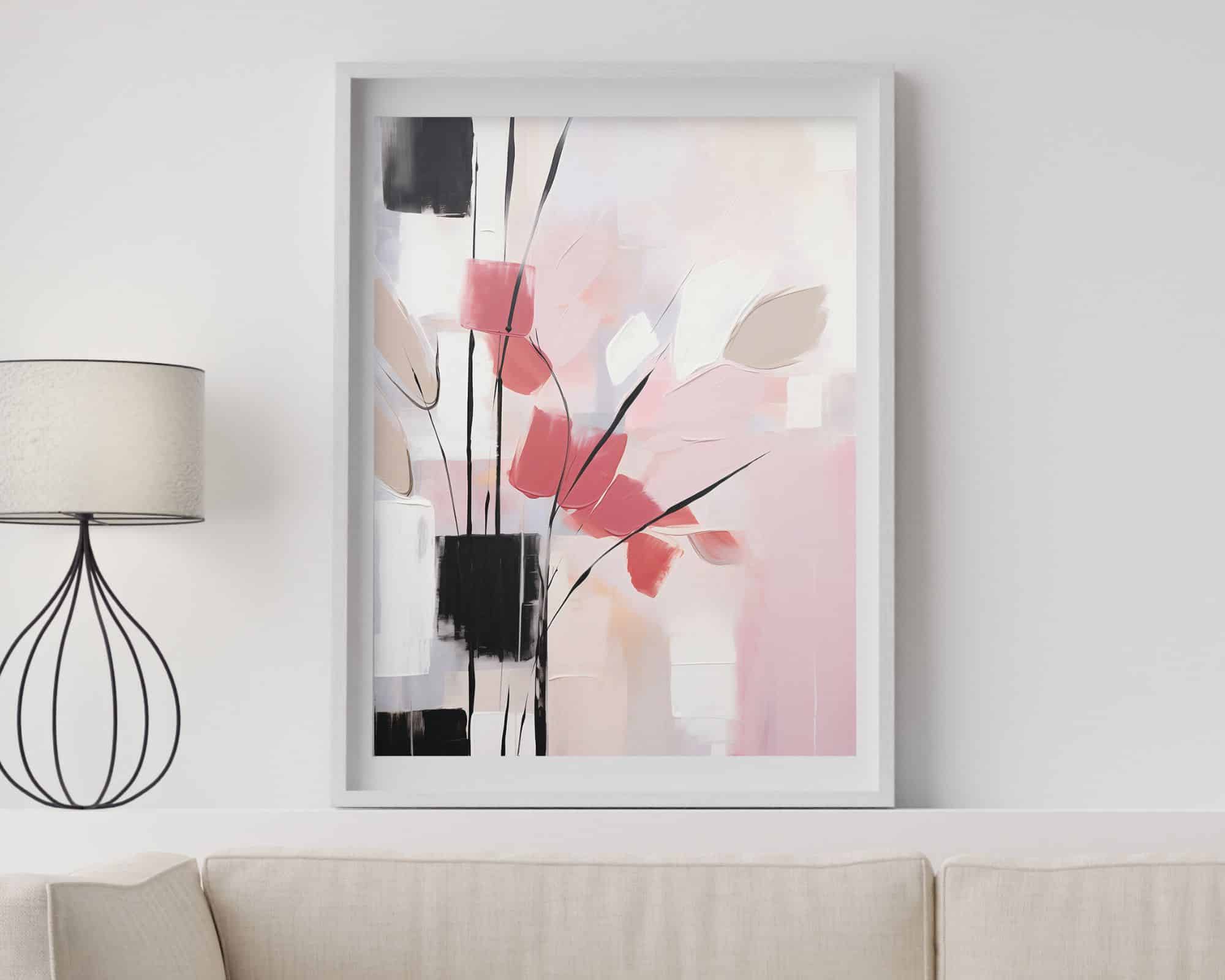 תמונה לחדר שינה בעיצוב אבסטרקט פרחים בצבע ורוד ונגיעות שחור