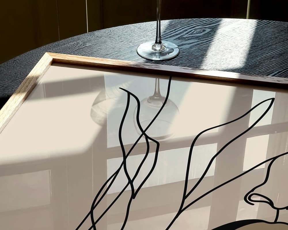 תמונה לחדר שינה בעיצוב מינימליסטי ציור קווי אישה ועלים צבע בז’