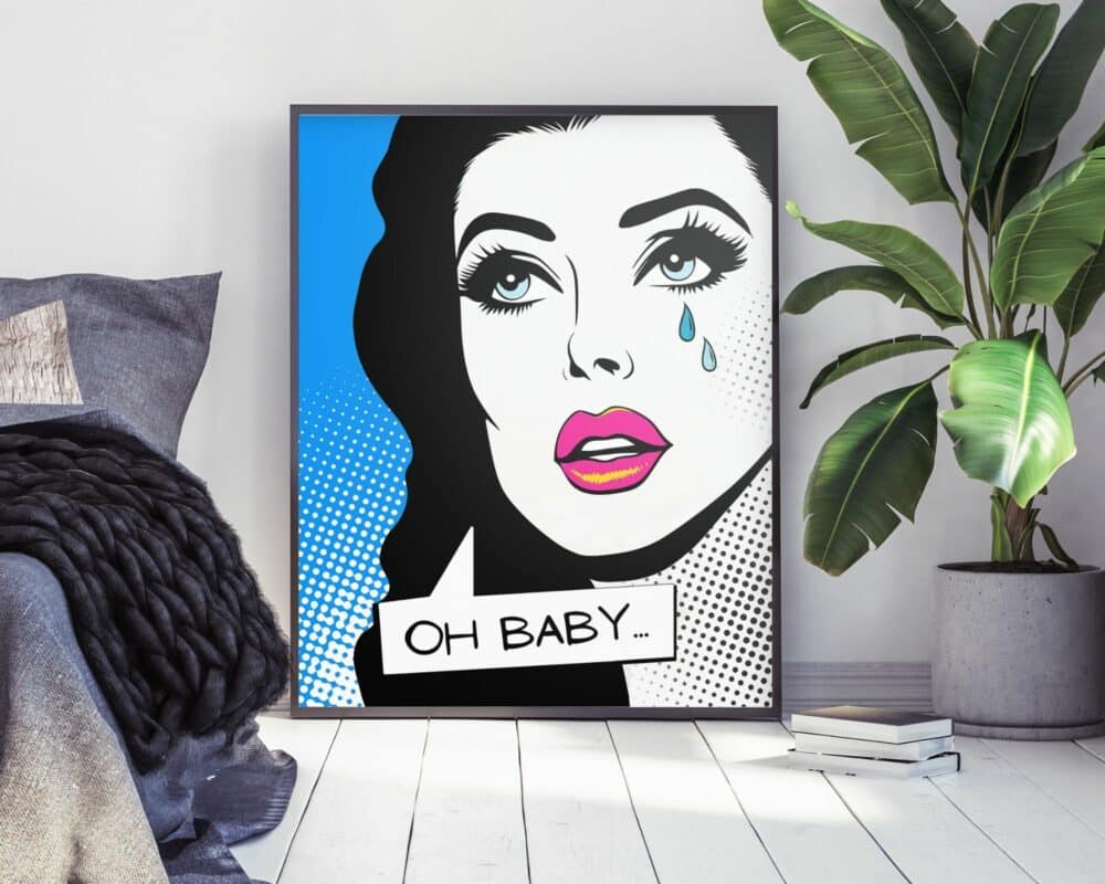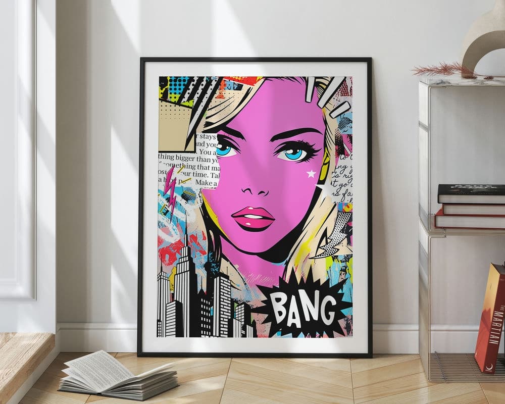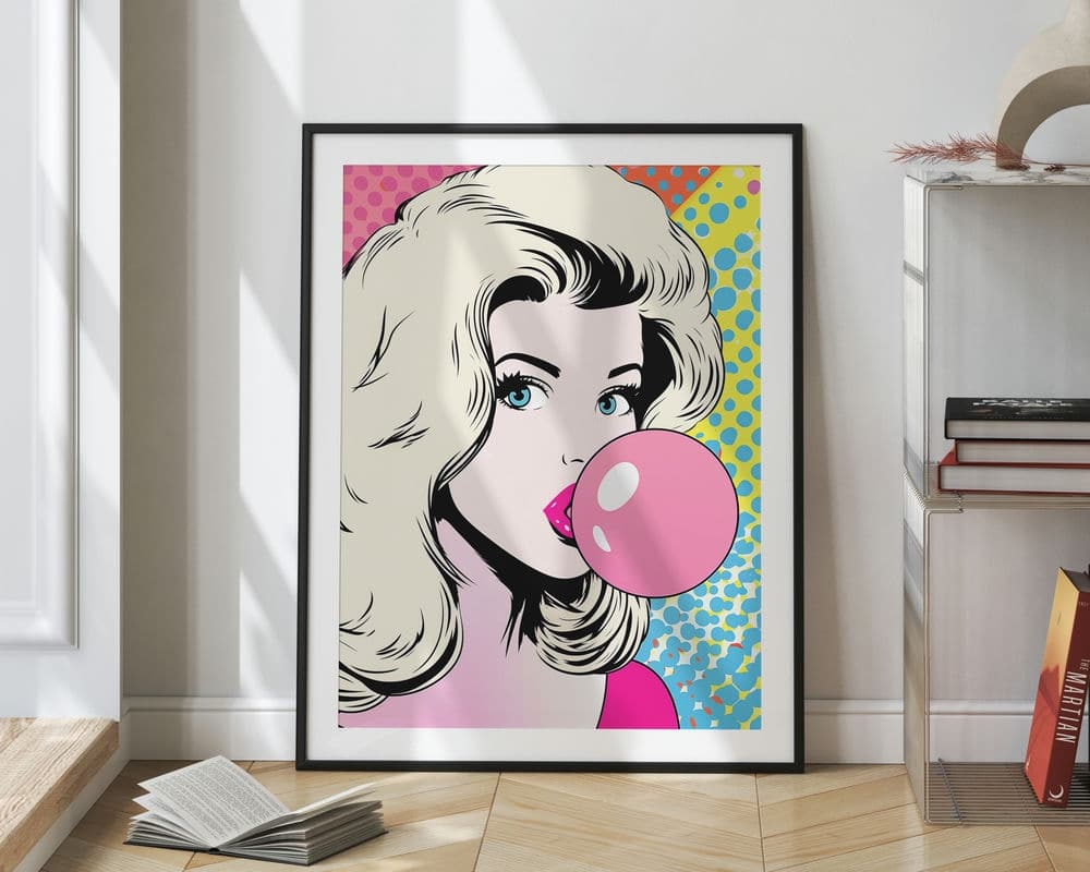 הפוסטר הזה בסגנון פופ ארט של אישה עם בלון מסטיק מושלם להוספת לתלייה בחדר נוער, בסלון, או בכל חדר אחר. אפשרות לפוסטר בודד או לפוסטר ממוסגר מראש במסגרות איכותיות בהכנה אישית!