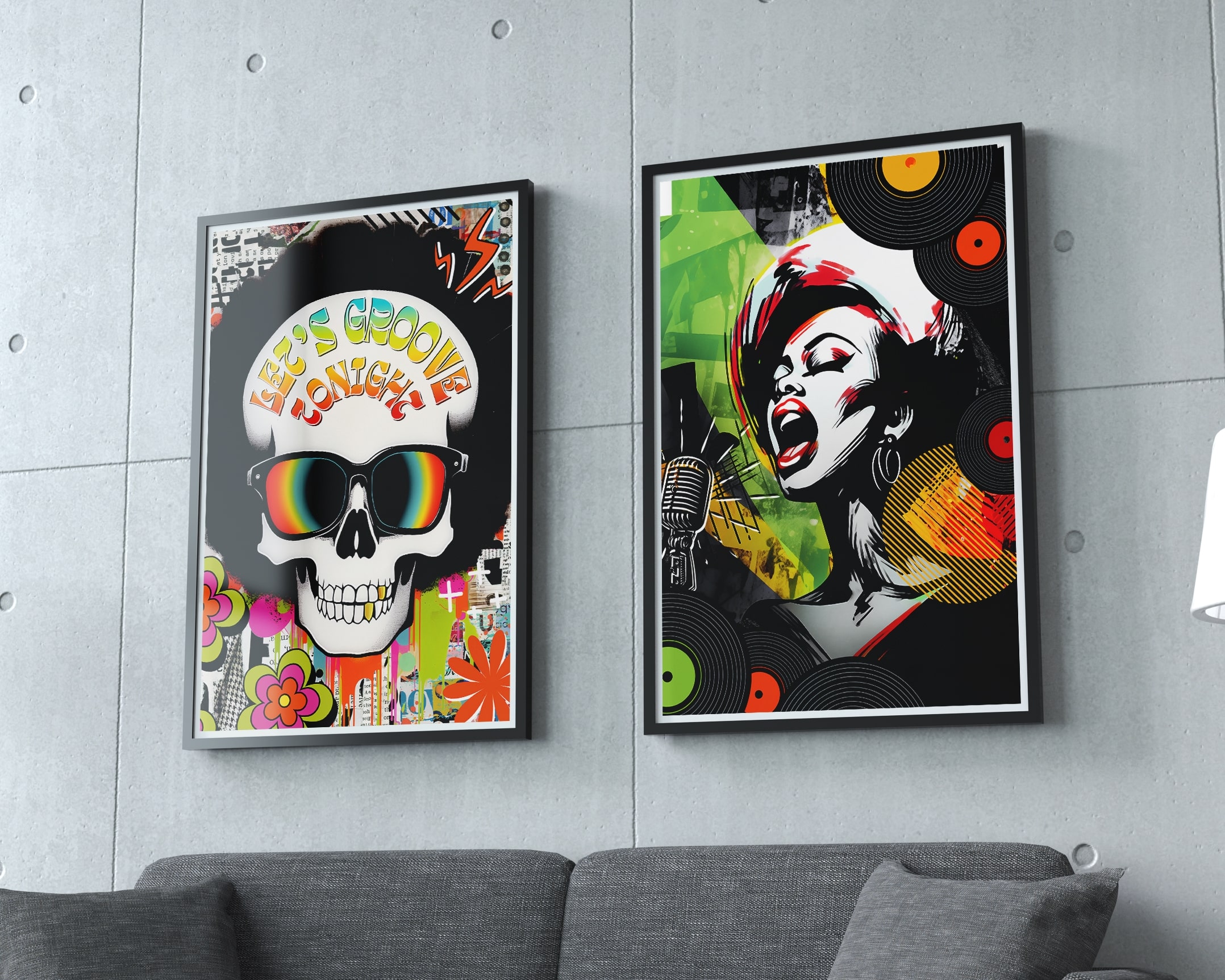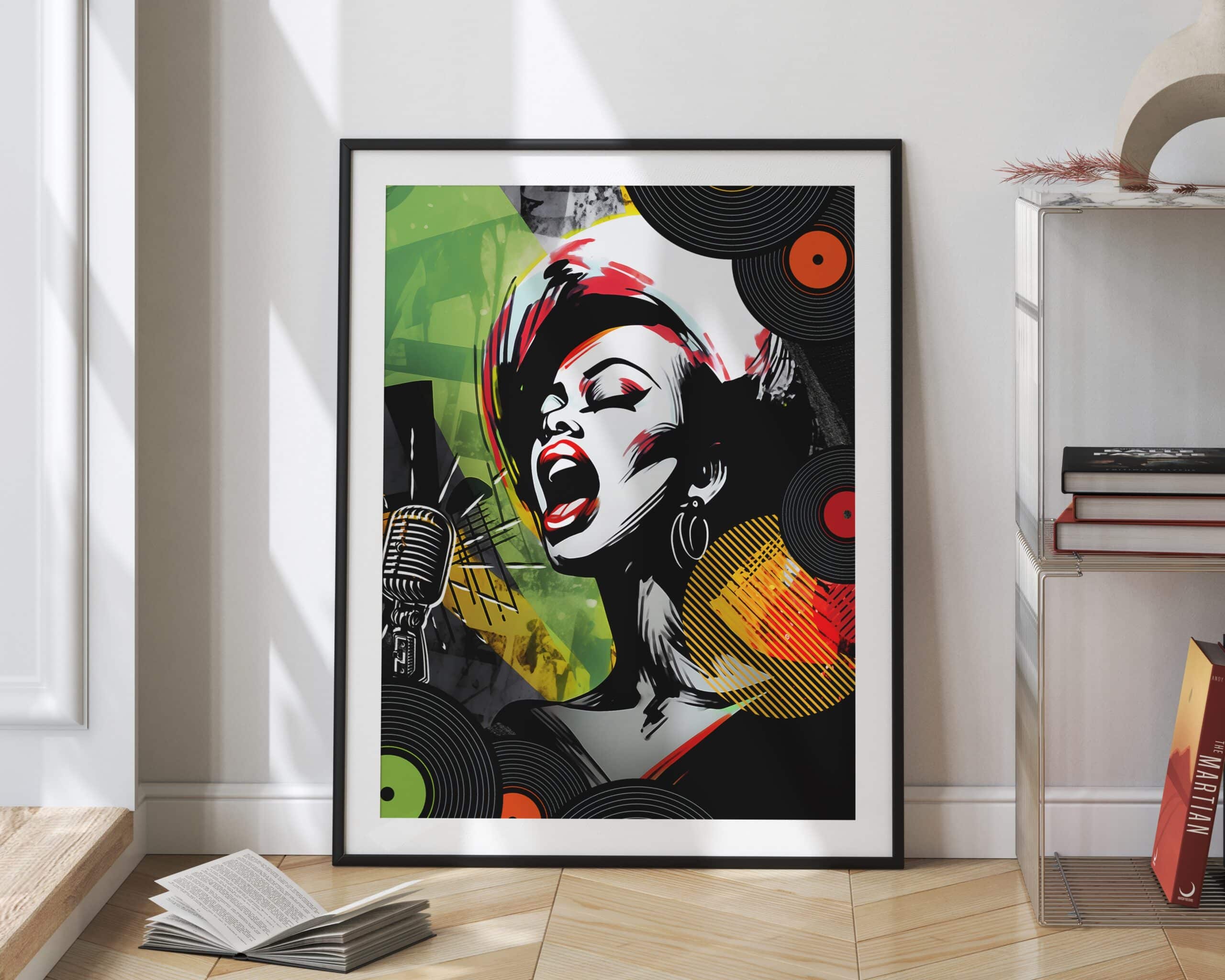 הפוסטר הזה בסגנון פופ ארט של אישה שחורה שרה בעיצוב דיסקו מגניב יהיה הטאצ’ האחרון שישלים לכם את הסלון לחלל המושלם. אפשרות לפוסטר בודד או לפוסטר ממוסגר מראש במסגרות איכותיות בהכנה אישית!