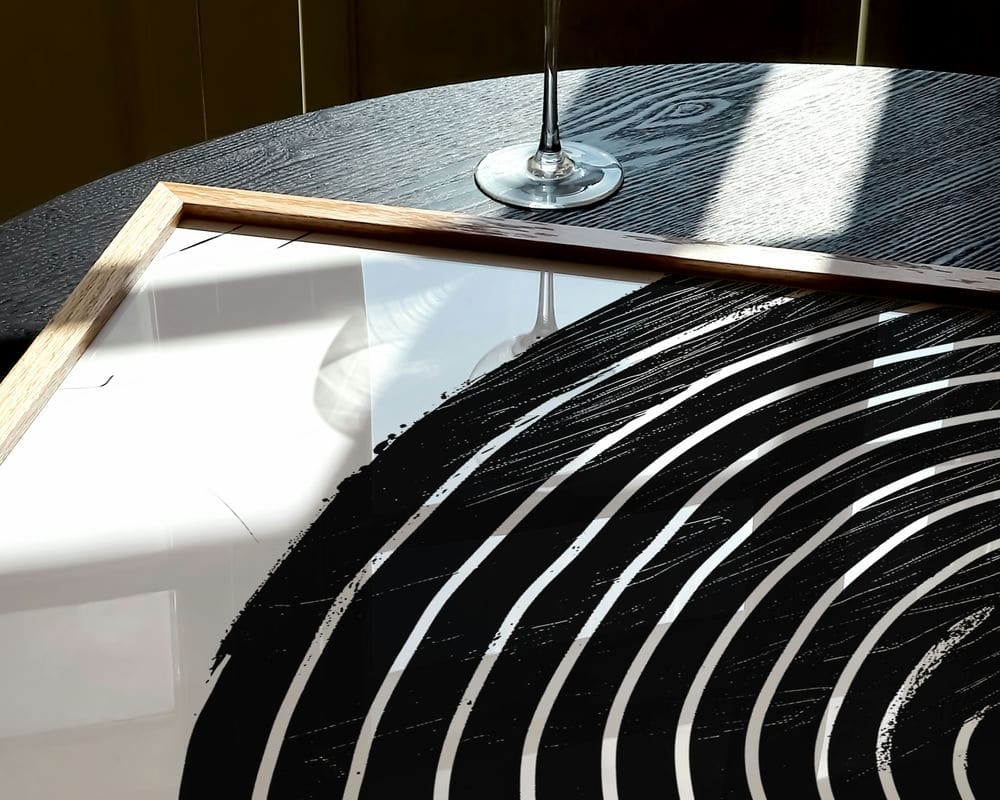 תמונה למשרד בעיצוב מינימליסטי עיגול שחור עם קווים לבנים