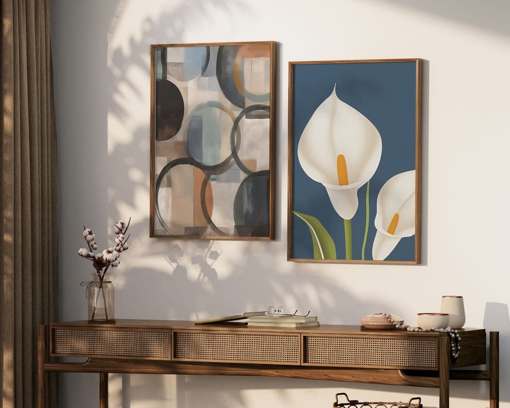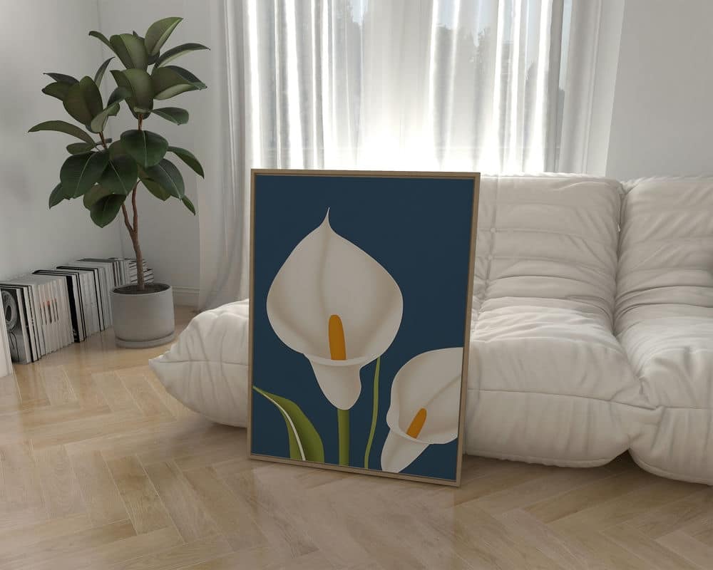 הפוסטר המינימליסטי הזה של זוג פרחי קאלות בצבע לבן על רקע כחול מושלם לתלייה במגוון חדרים, כמו בחדר שינה או בפינת אוכל. אפשרות לפוסטר בודד או לפוסטר ממוסגר מראש במסגרות איכותיות בהכנה אישית!