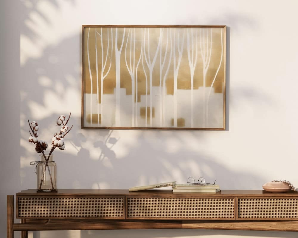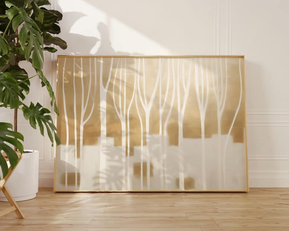 תמונה מעל המיטה בסגנון אבסטרקט ענפים על רקע זהב ולבן