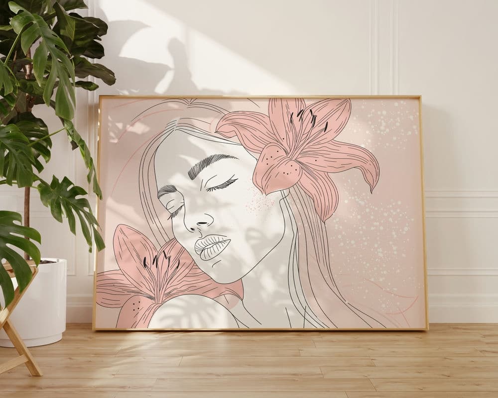 החל מ: 138.60 ₪תמונה מעל המיטה בעיצוב מינימליסטי אישה עם פרח ורוד