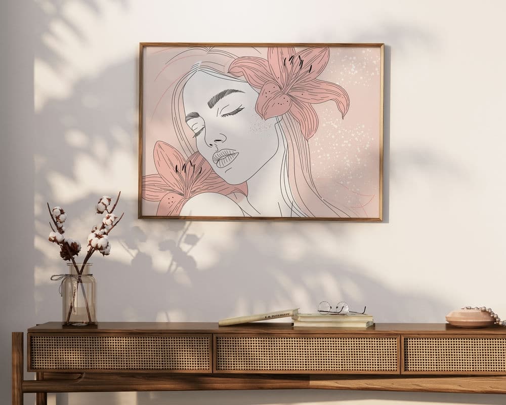 תמונה מעל המיטה בעיצוב מינימליסטי אישה ושושנים ורודים
