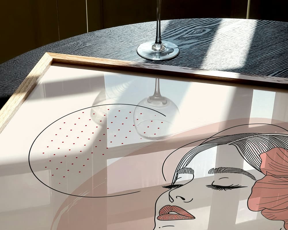 תמונה מעל המיטה בעיצוב מינימליסטי אישה עם פרח ורוד