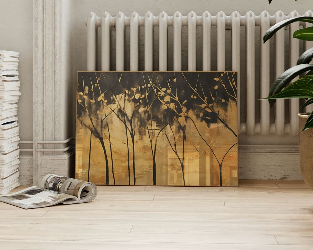 תמונה מעל הספה בסגנון אבסטרקט עצים על רקע זהב