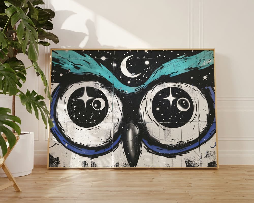 הפוסטר הזה בעיצוב גרפיטי של ינשוף עם כוכבים וירח מתאים במיוחד לתלייה מעל הספה או המיטה. אפשרות לפוסטר בודד או לפוסטר ממוסגר מראש במסגרות איכותיות בהכנה אישית!