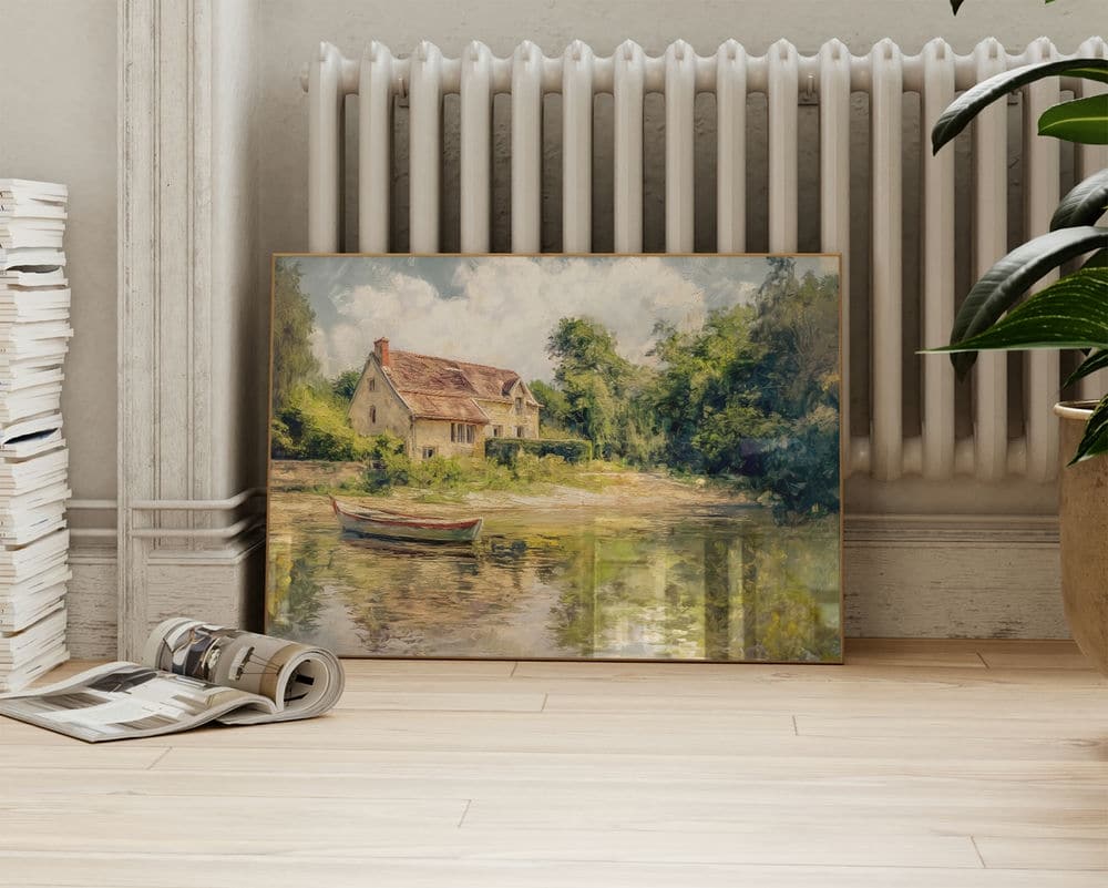 תמונה מעל הספה בסגנון ציור וינטג’ בית על שפת אגם