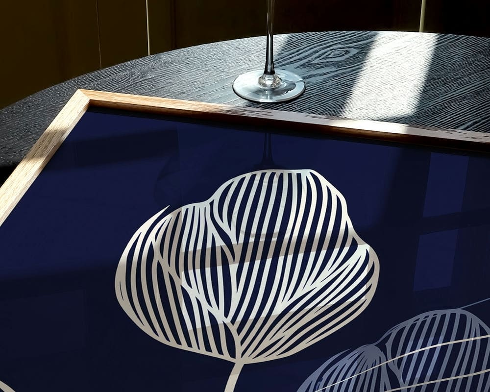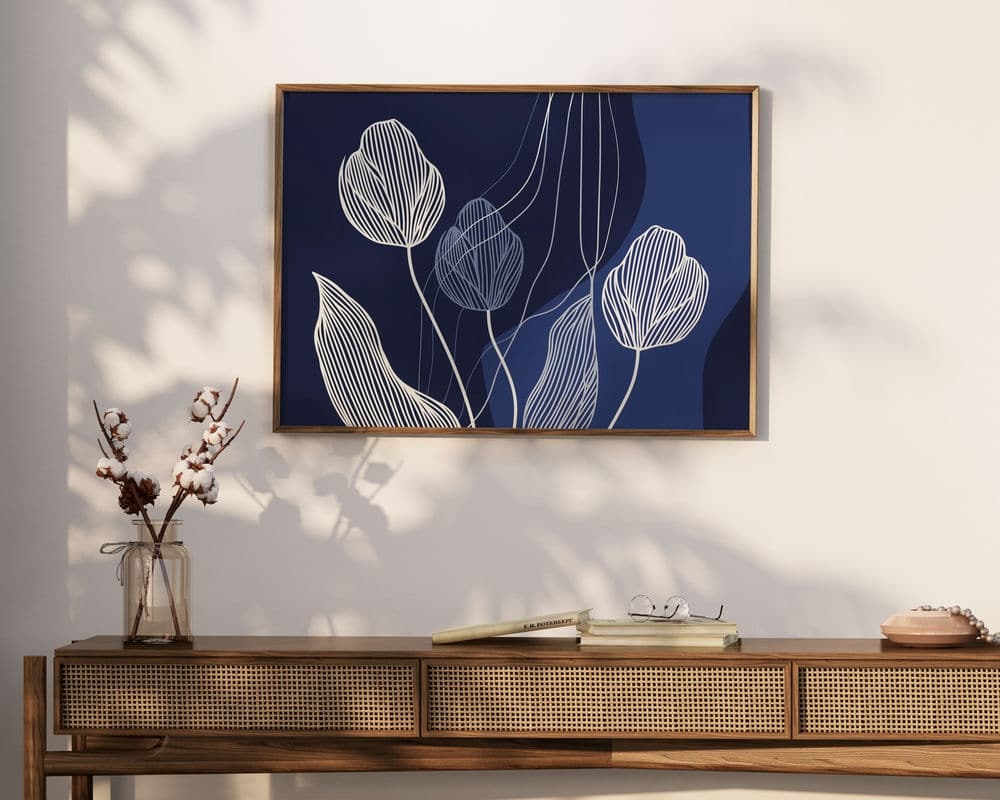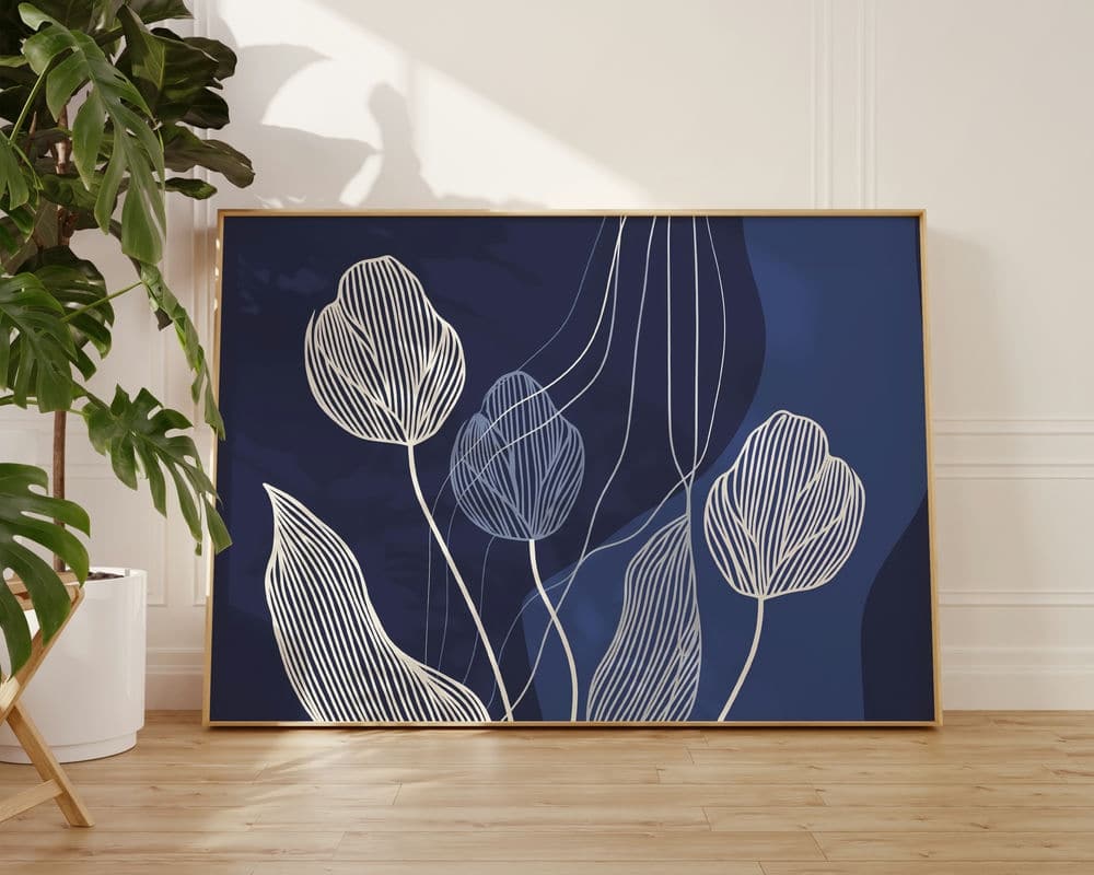 תמונה מעל הספה בעיצוב מינימליסטי פרחים על רקע כחול כהה